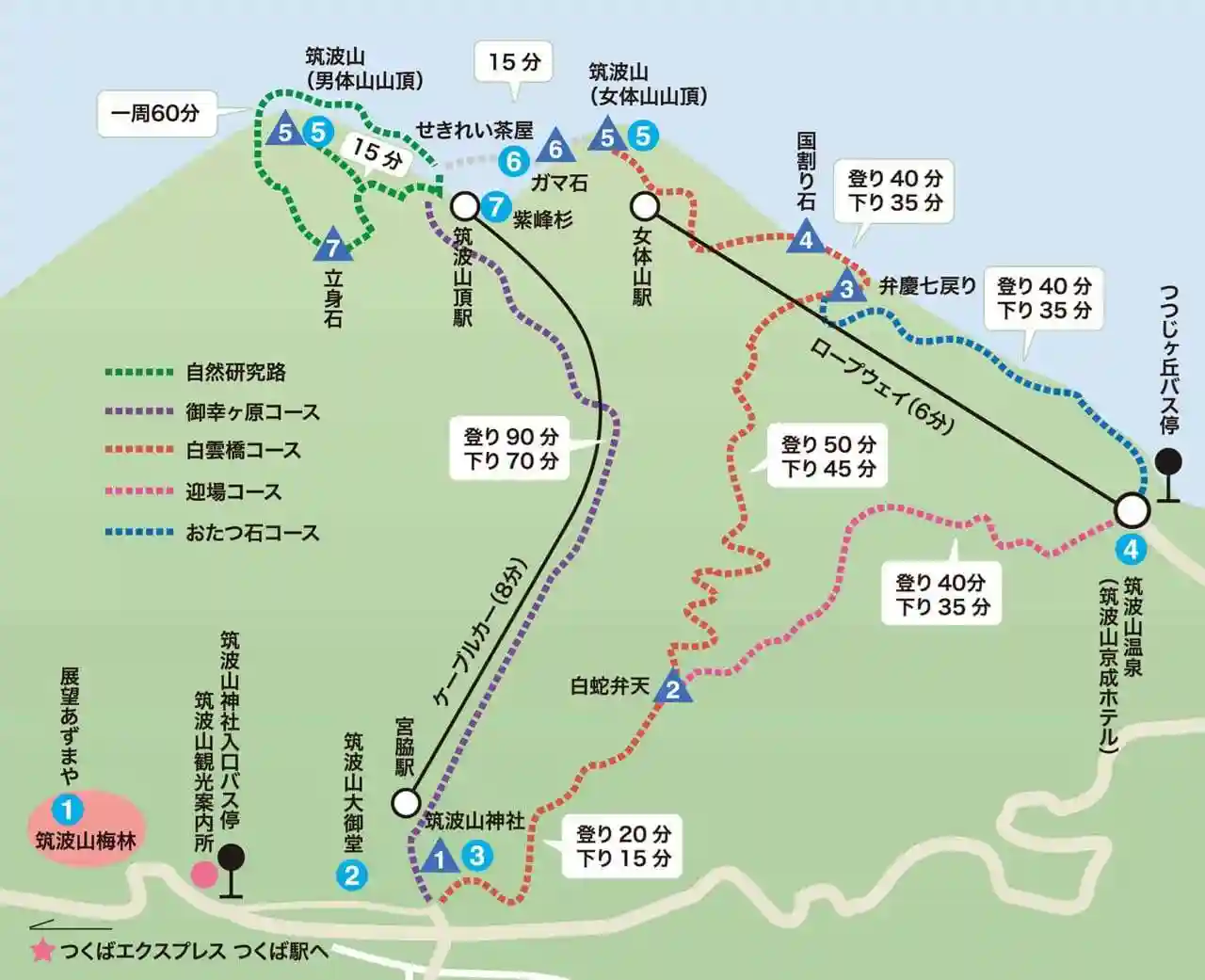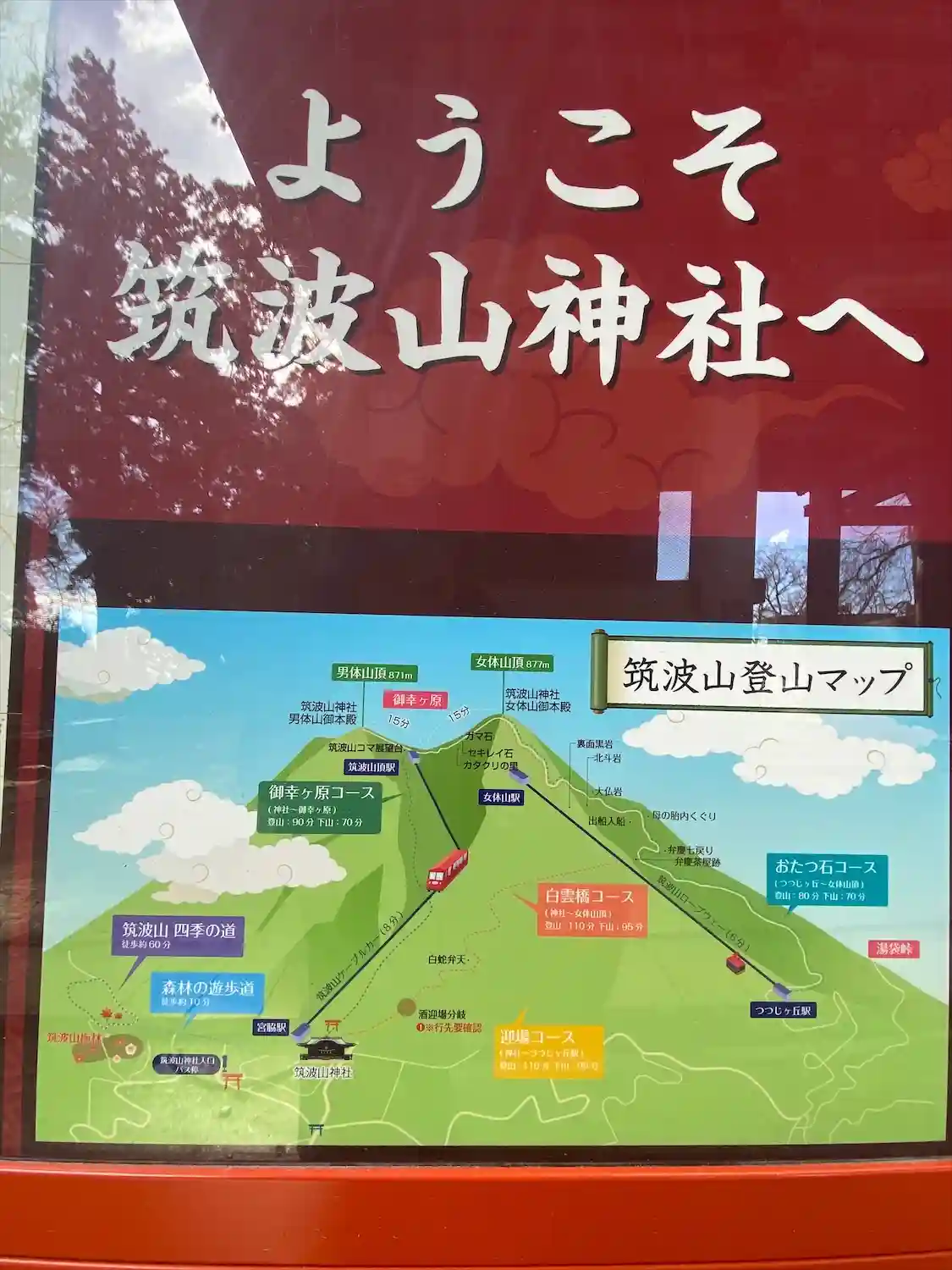 アクセスでバス利用者でしたら“おたつ石コース”から登って、“白雲橋コース”で下山して筑波山神社→筑波山御御堂→梅まつりのコースが良いかと思います。車利用者だと駐車場の位置に問題が発生します。