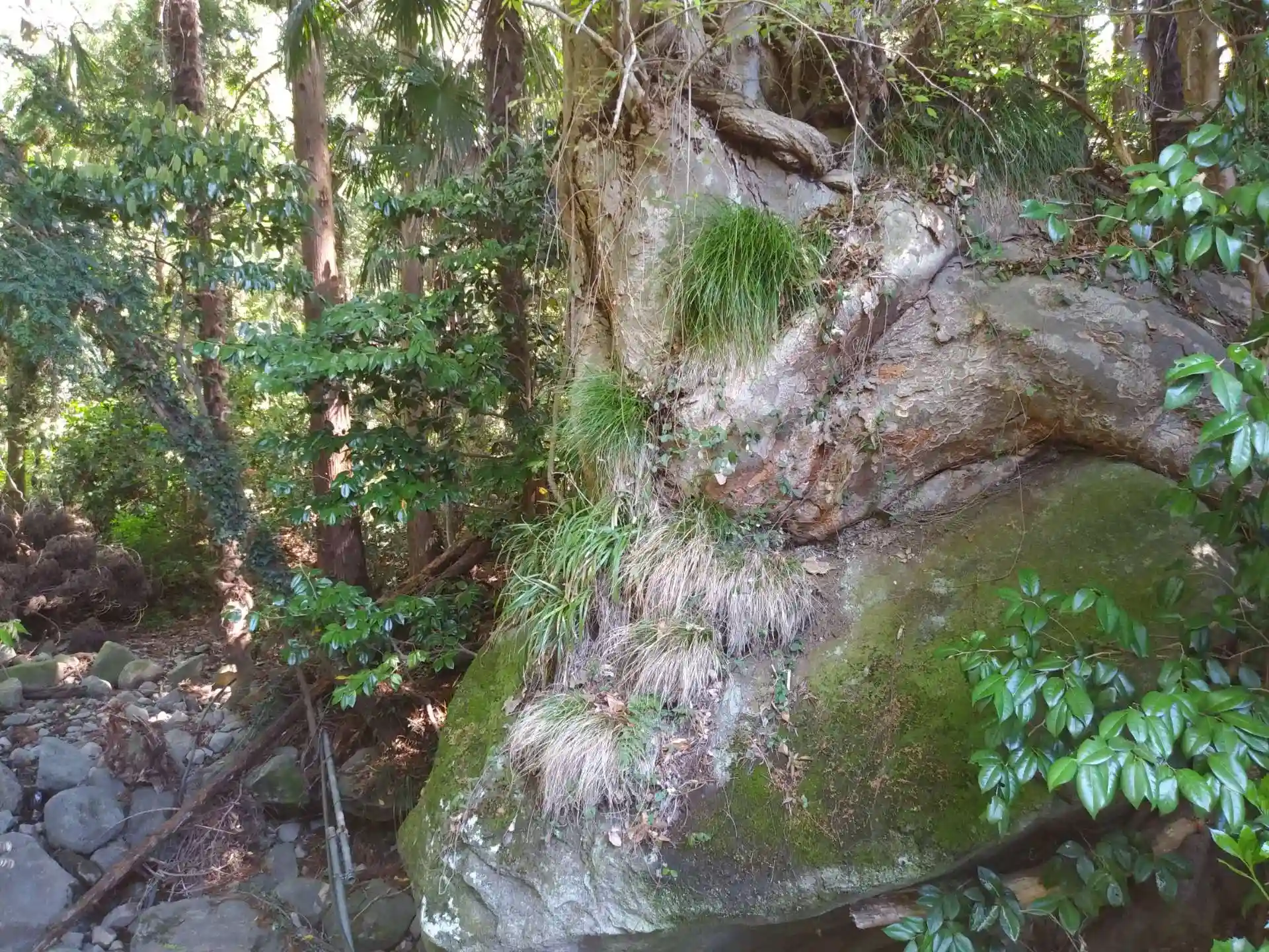 細い山地を辿ると沢があり、傍らに岩を咥え込んだ巨木があります。