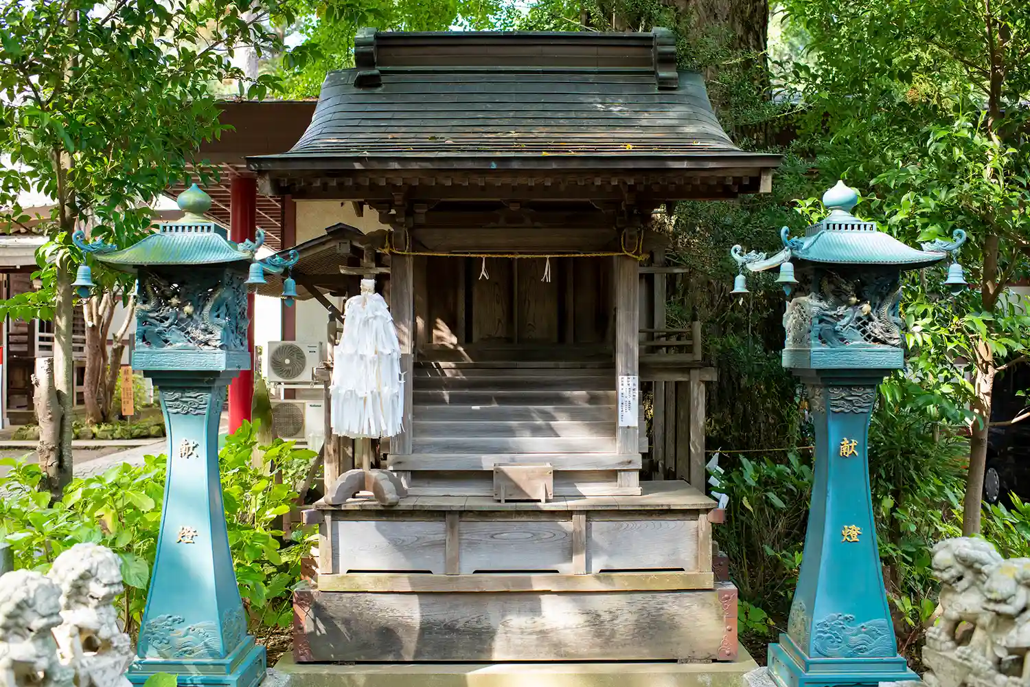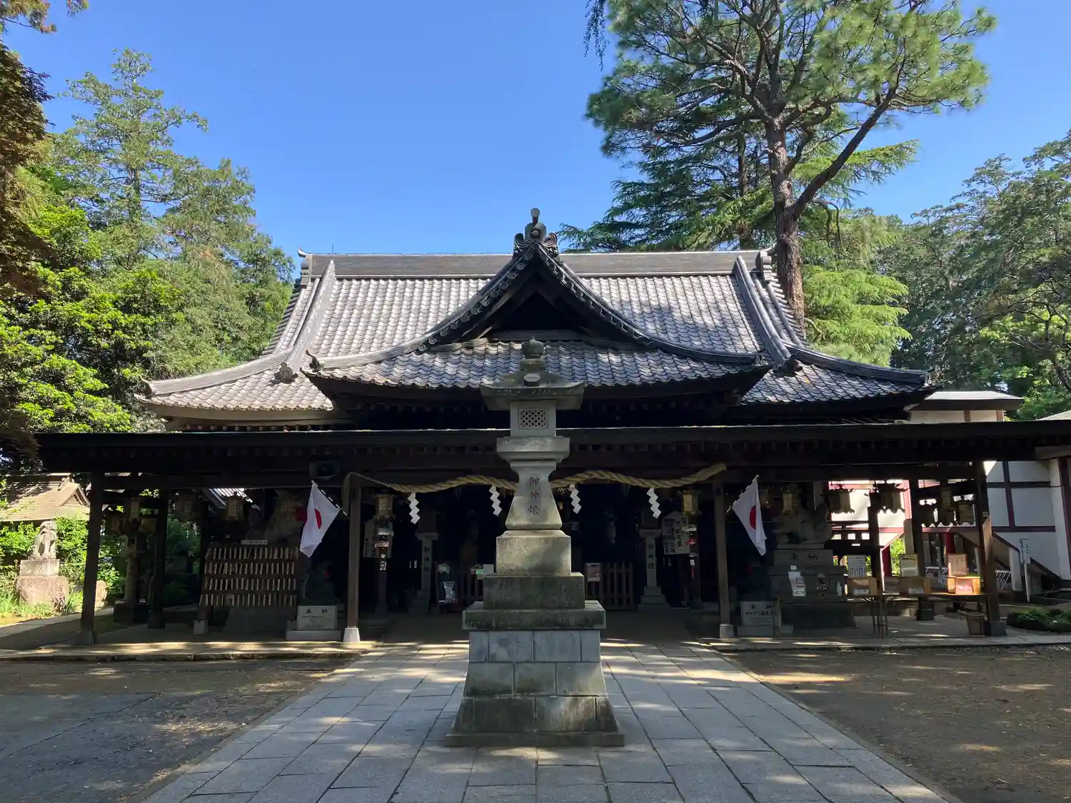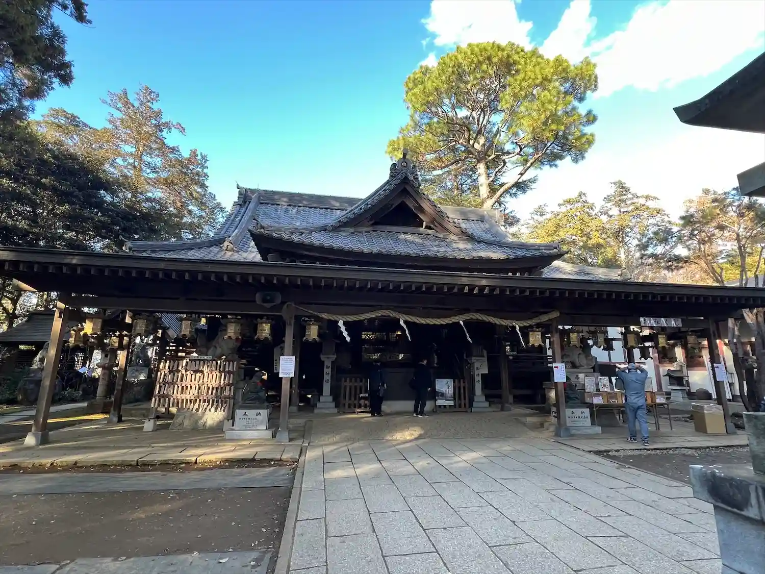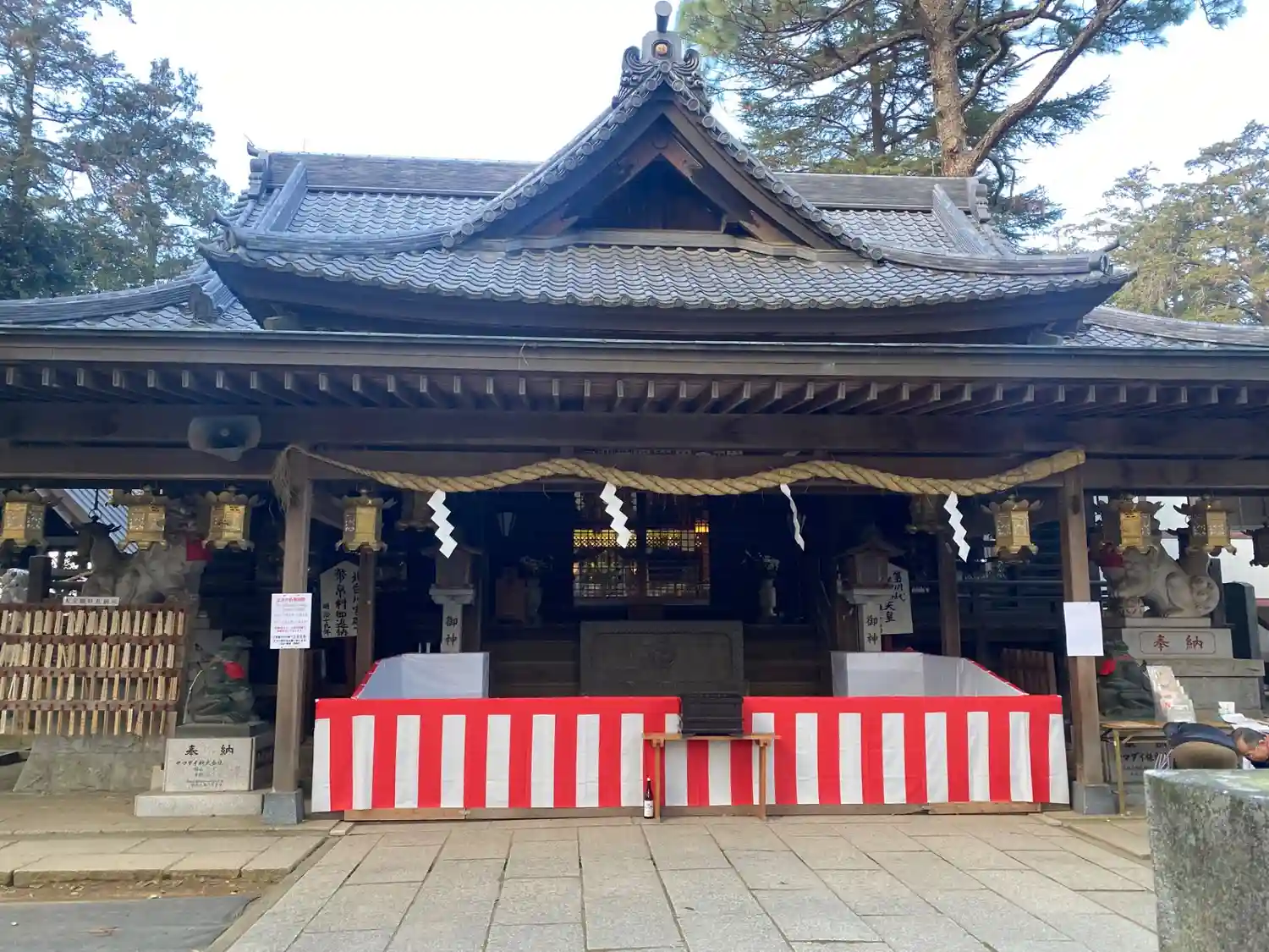 拝殿前の和傘飾りと狛犬さんたち