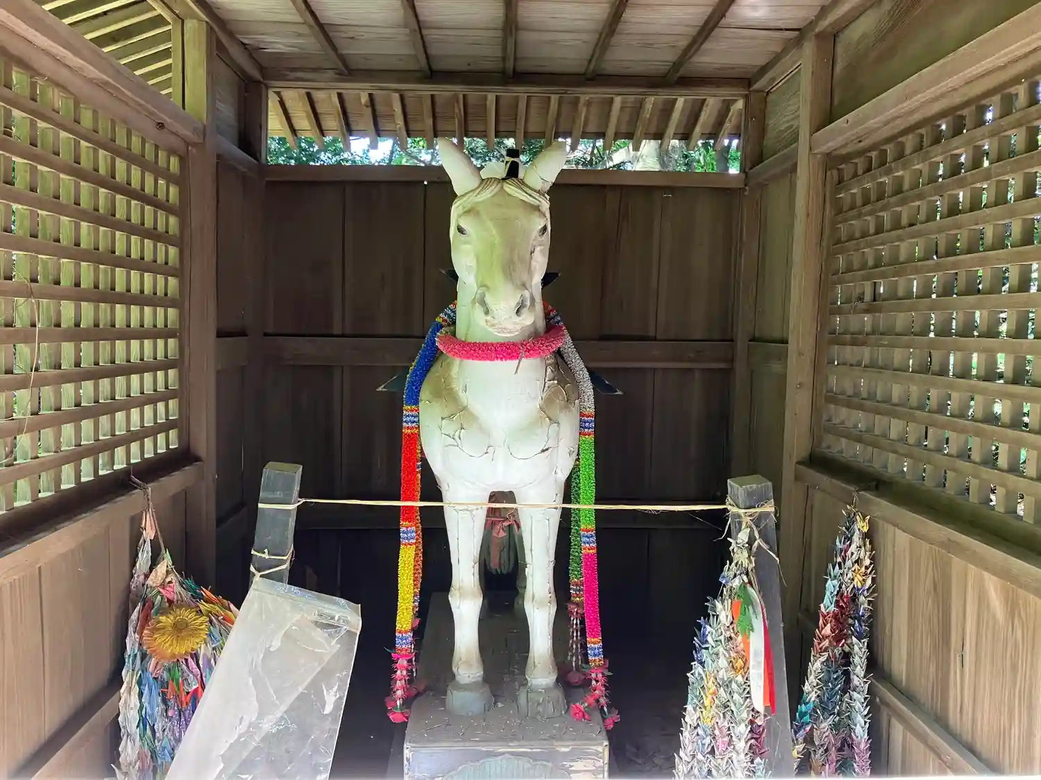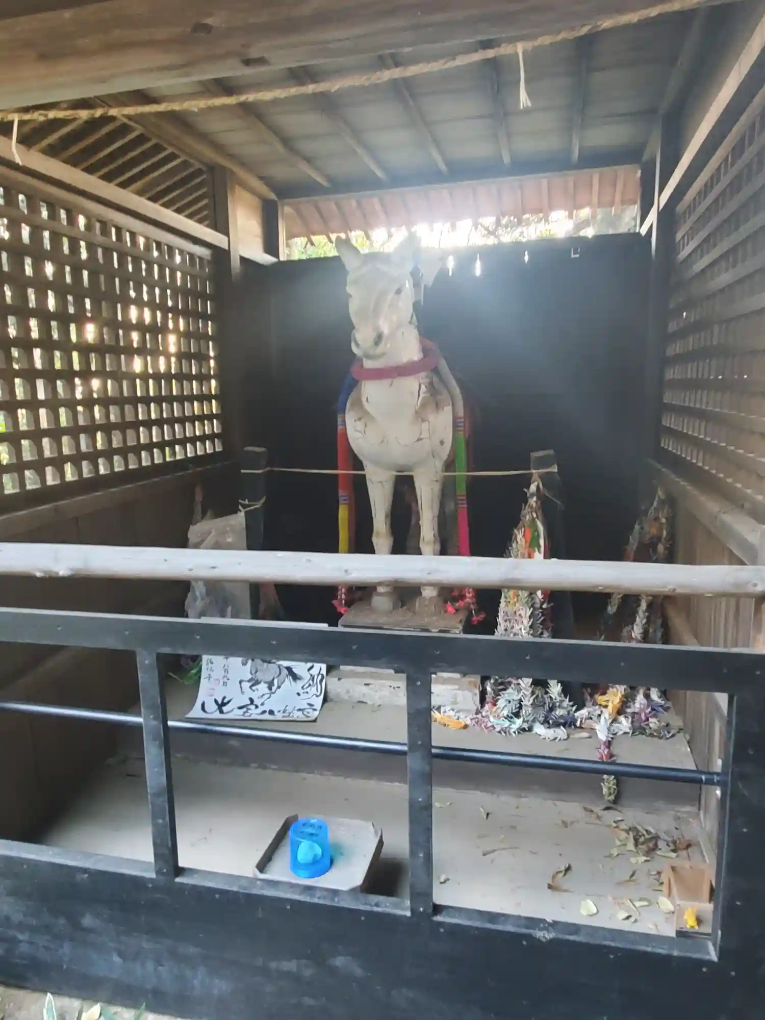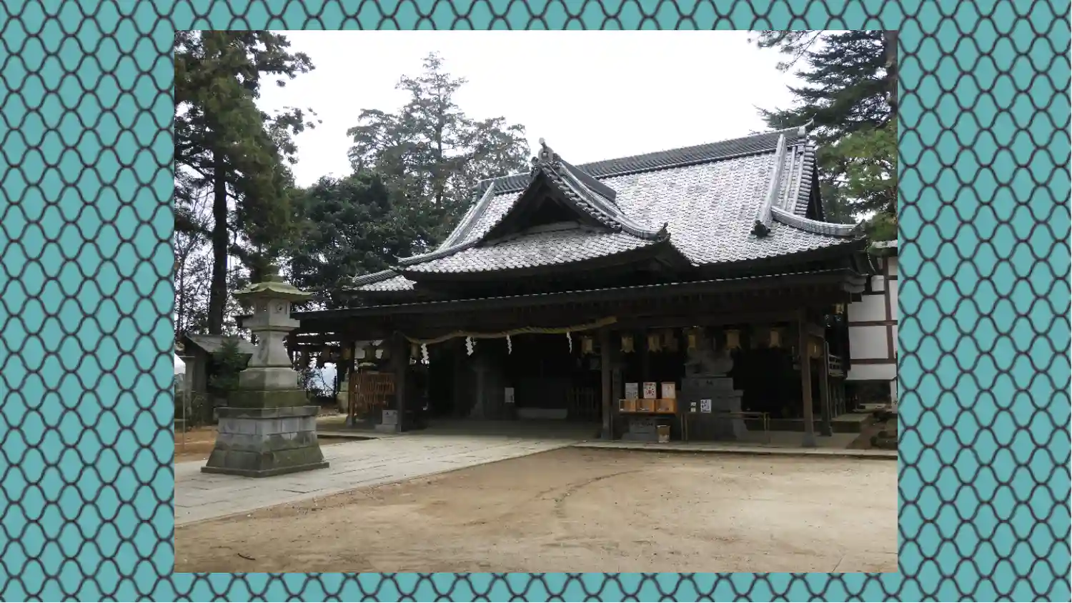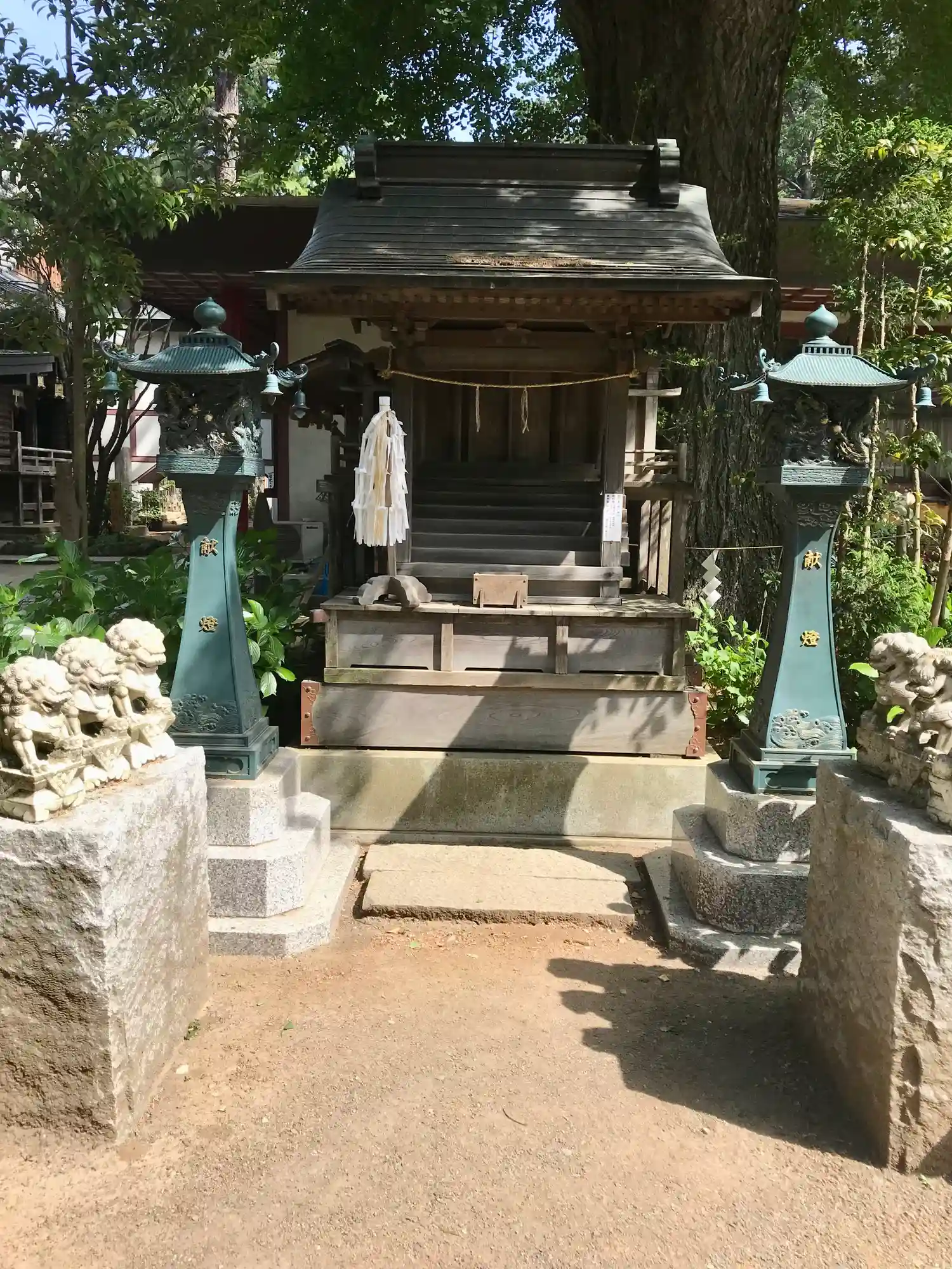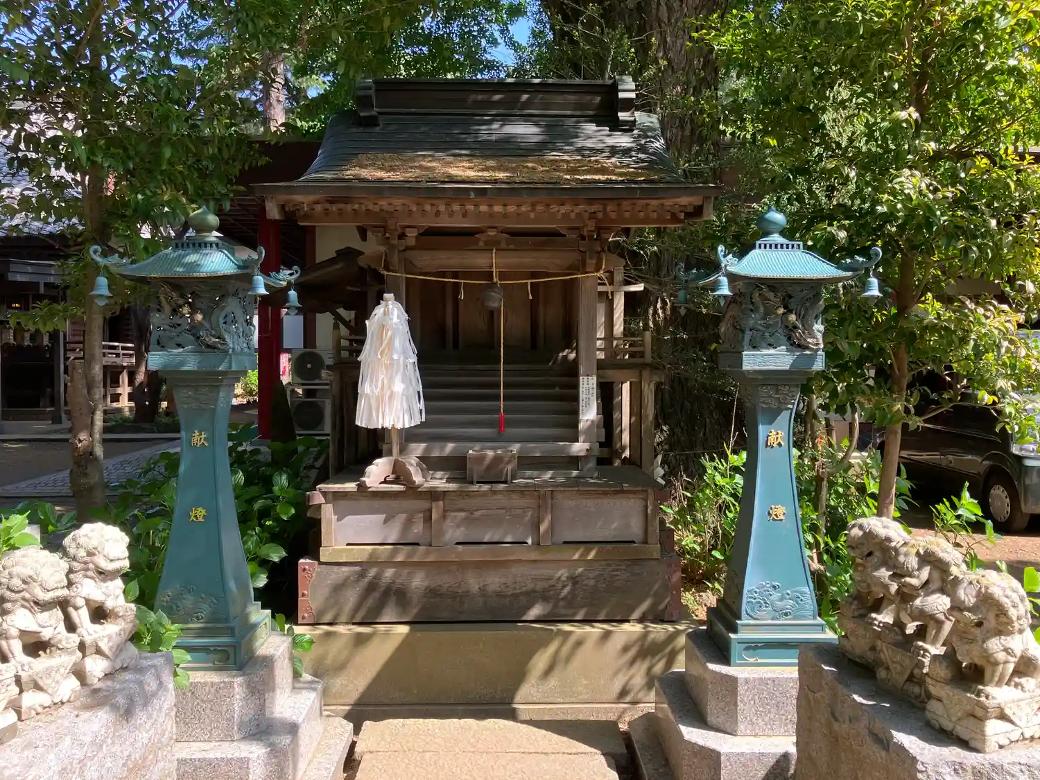 拝殿前の和傘飾りと狛犬さんたち