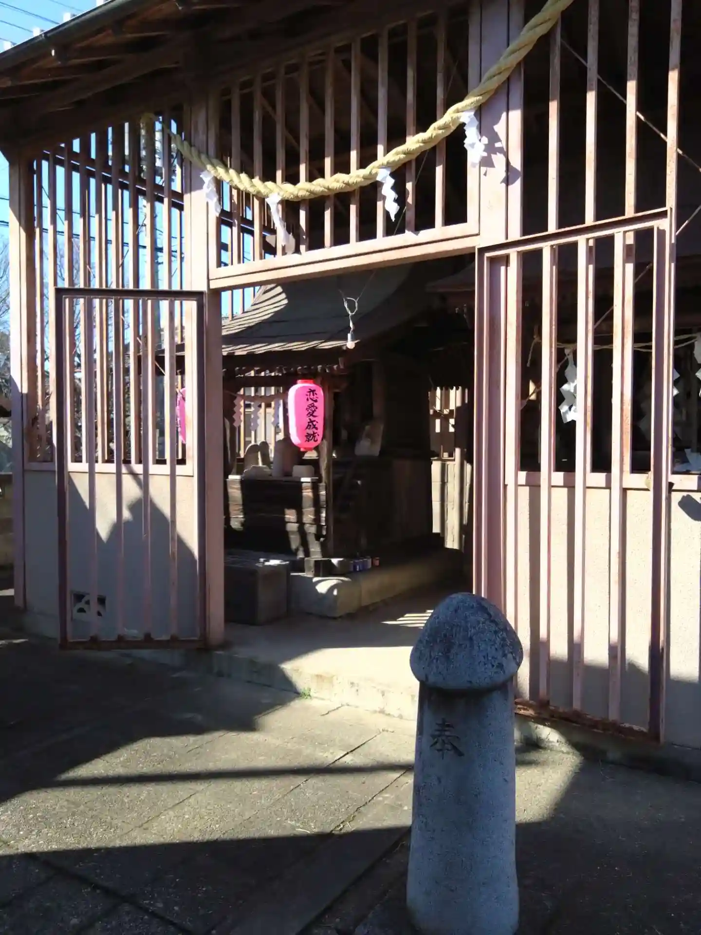 こちらの道祖神は性神として地域の方に信仰されています。昔の出産は衛生面からも決して安全ではなかったでしょうし、子供を授かることが一族の繁栄に繋がるため、大切に祀られてきたのでしょうね。本殿には現代らしく恋愛成就の提灯が掛かっていました。