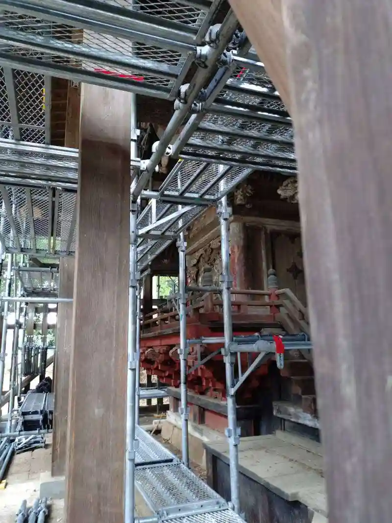 貞享2年(1685)前後に再建されたもので一間社流造、茅葺、正面1間向拝、浜縁、高欄、宝珠付、建物全体が朱色、細部は極彩色で彩られ壁面には中国故事、木鼻には獅子、象、懸魚と降懸魚には鳳凰、妻面には飛龍など豊かで精巧な彫刻が随所に施された建物です。