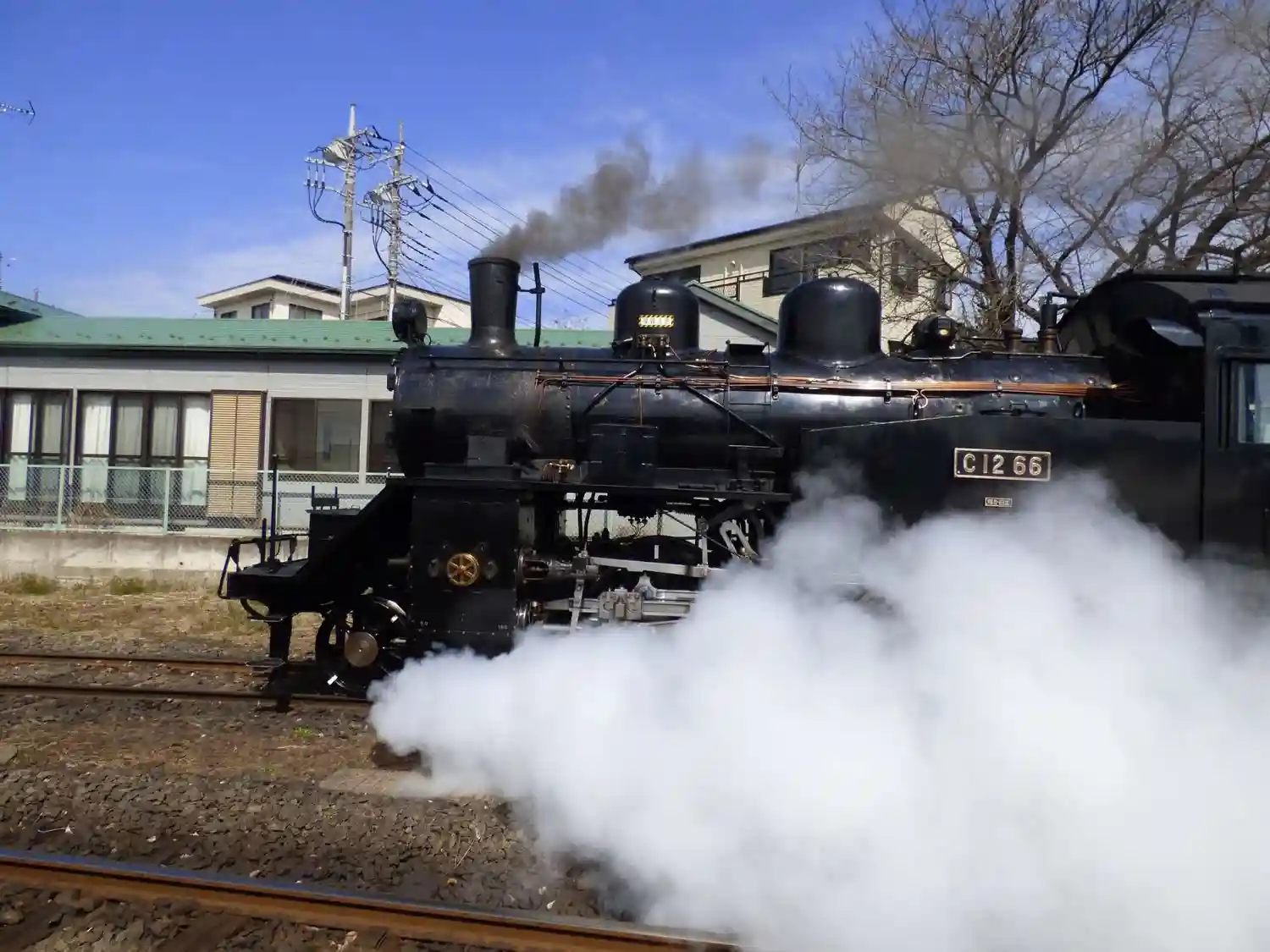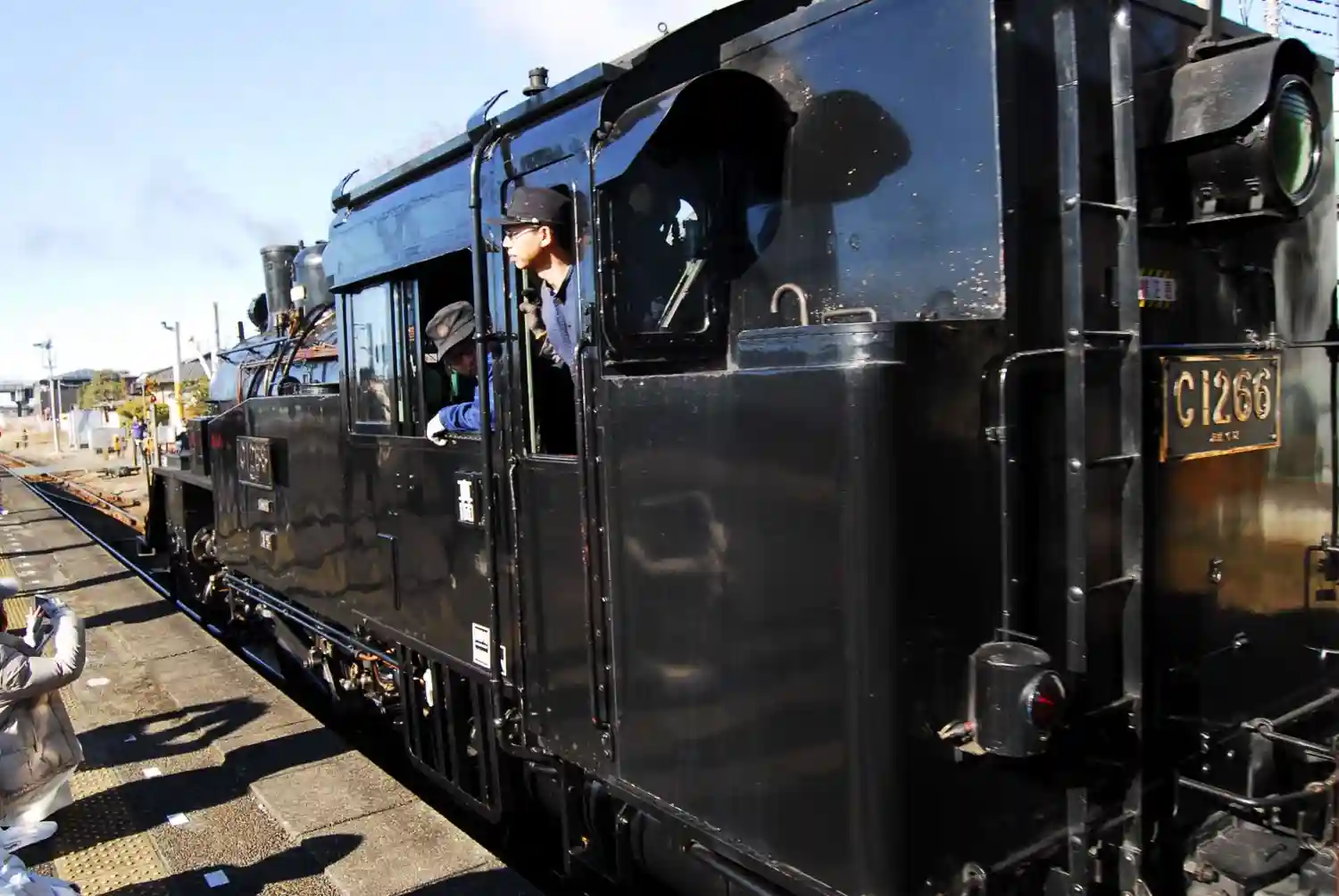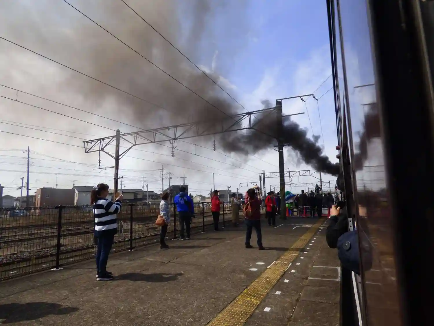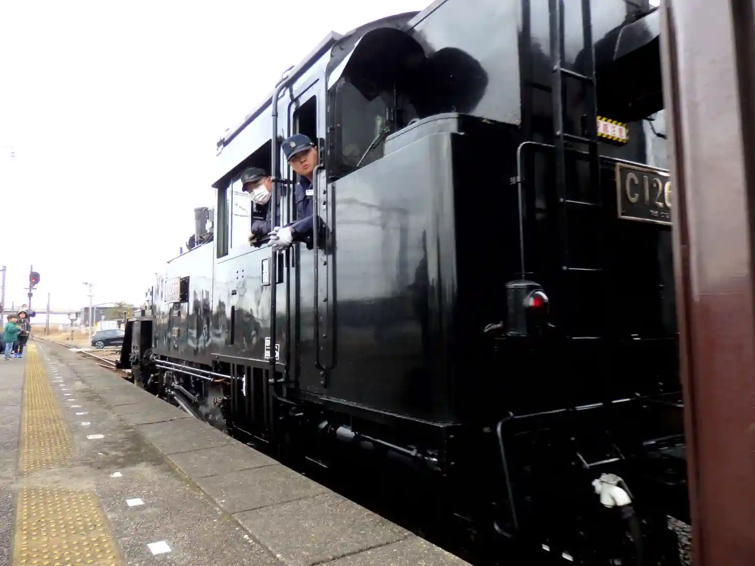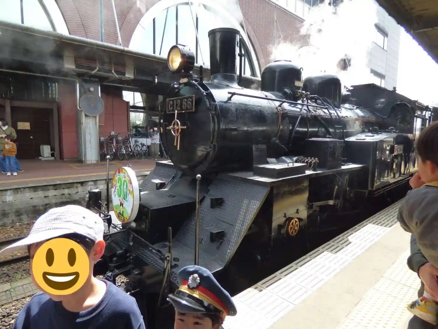 煙と汽笛の迫力に、ひるんでぐらつきました。