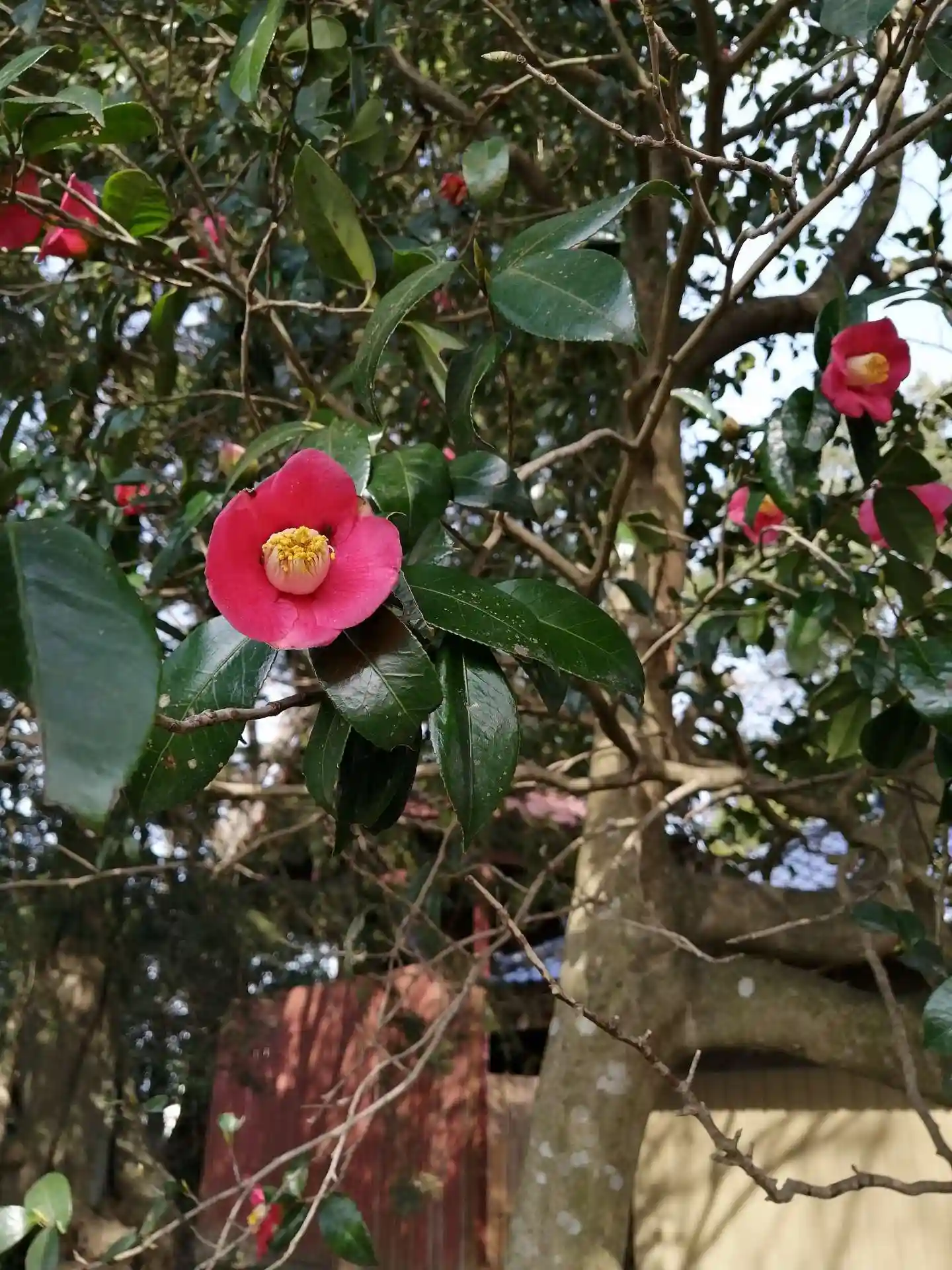 本殿の周りに沢山の椿が咲いていて