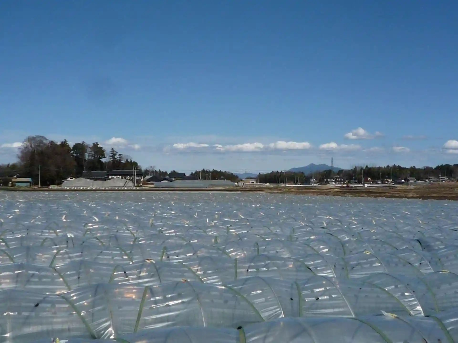 墓地の真中で目を転じれば、集落の田畑、遠くにはつくばの峰