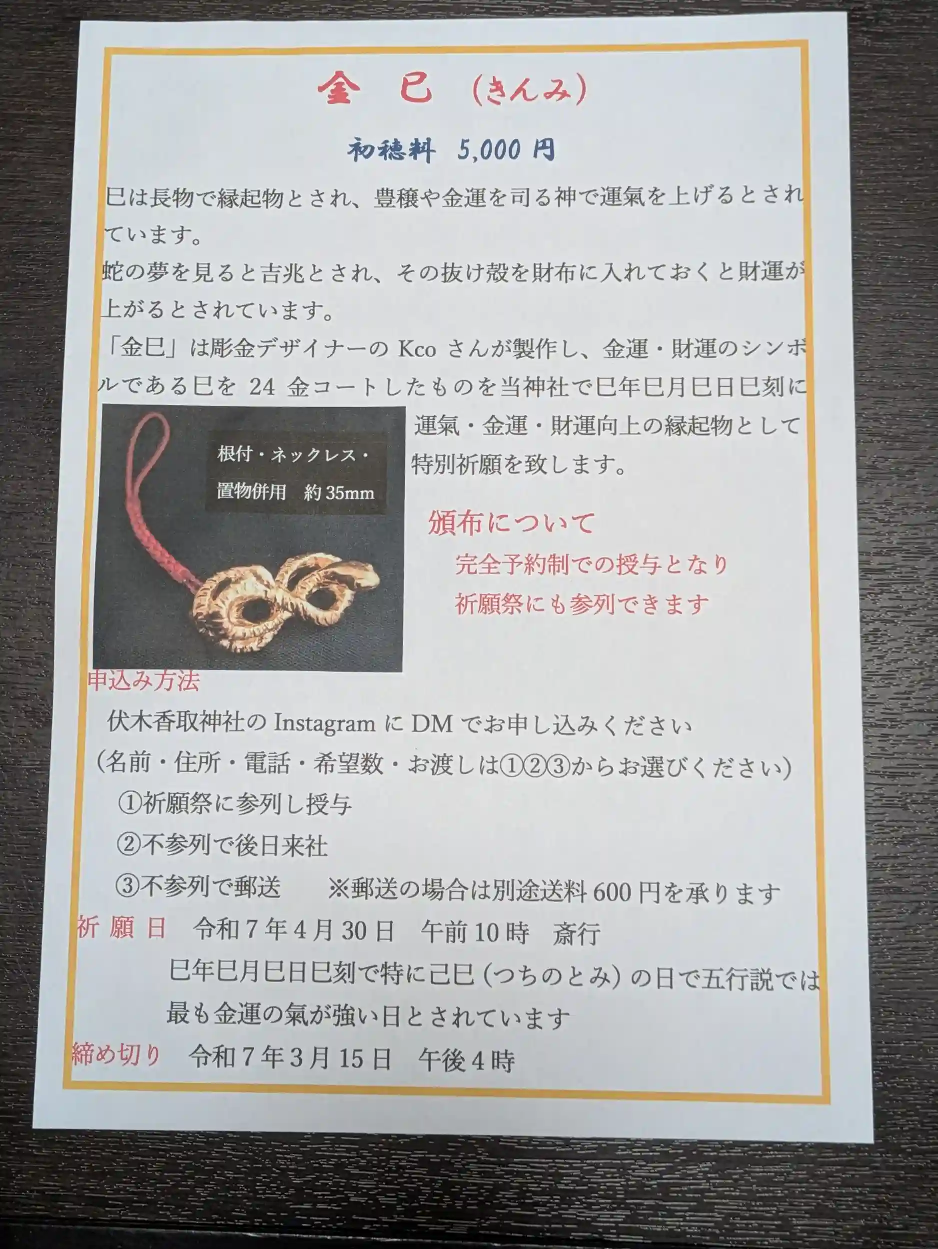 ルである巳を 24 金コートしたものを当神社で巳年巳月巳日巳刻に