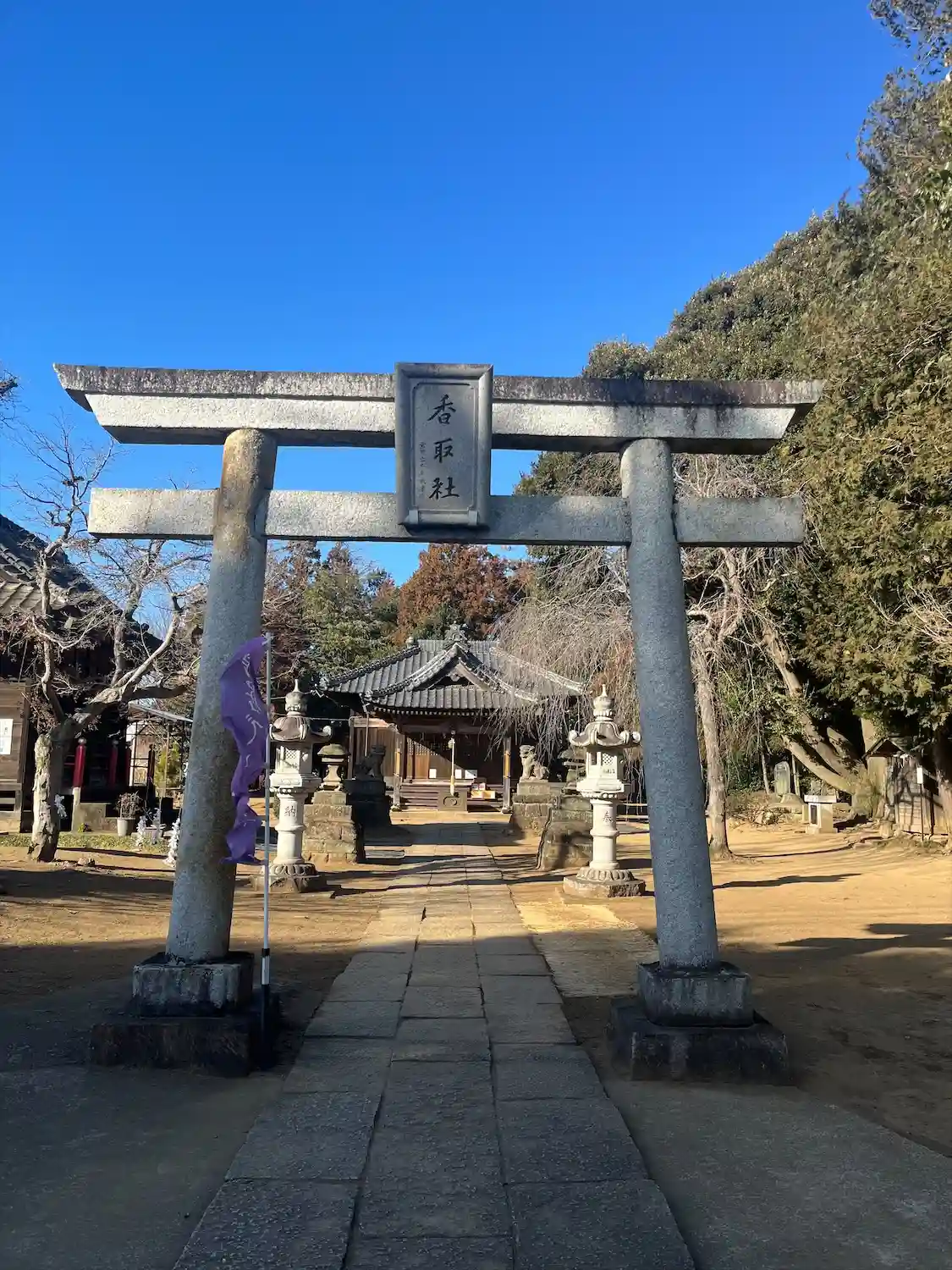 沓掛香取神社様から土浦境線を西へ行ったところにある伏木香取神社様へ。伏木香取神社は経津主命と誉田別命を主祭神としてお祀りしています。創建は後醍醐天皇の御大、下総国一ノ宮である香取神宮から分霊を勧請したのがその始まりといわれています。永徳3年(1383年)9月9日には現在の地に遷座されました。天正元年(1573年)、常陸国下妻城主、多賀谷重経によって焼き討ちに遭い被害を受けました。寛文2年(1662年)に再興されました。明治時代に入り、石鳥居が建設され大正元年(1912年)に村社に列格されました。令和5年(2023年)には御遷座650年祭が斎行されたそうです。周りには畑があり集落の中にある神社という印象でした。