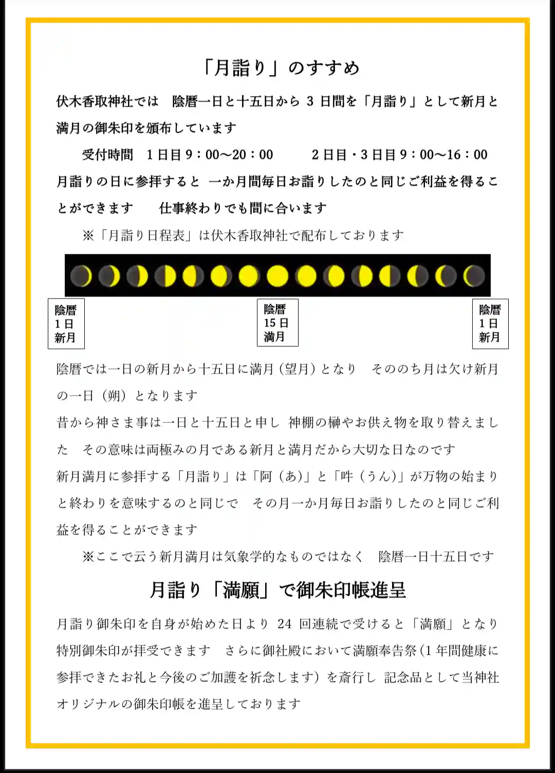 伏木香取神社ては 陰暦一日と十五日から3日間を「月詣り」として新月と満月の御朱印を頒布しています