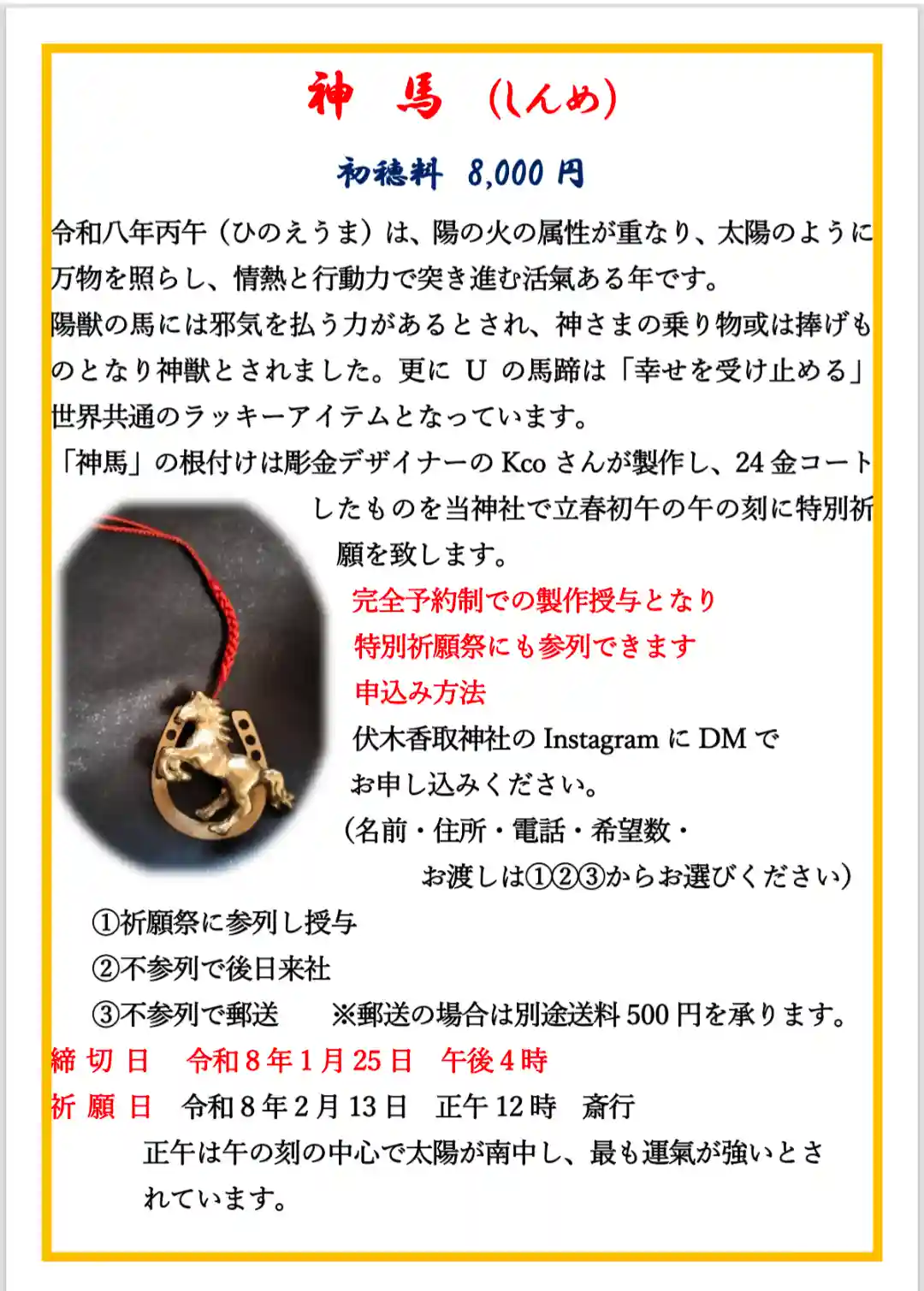 「神馬」の根付けは彫金デザイナーの Kco さんが製作し、24 金コートしたものを当神社で立春初午の午の刻に特別祈願を致します。