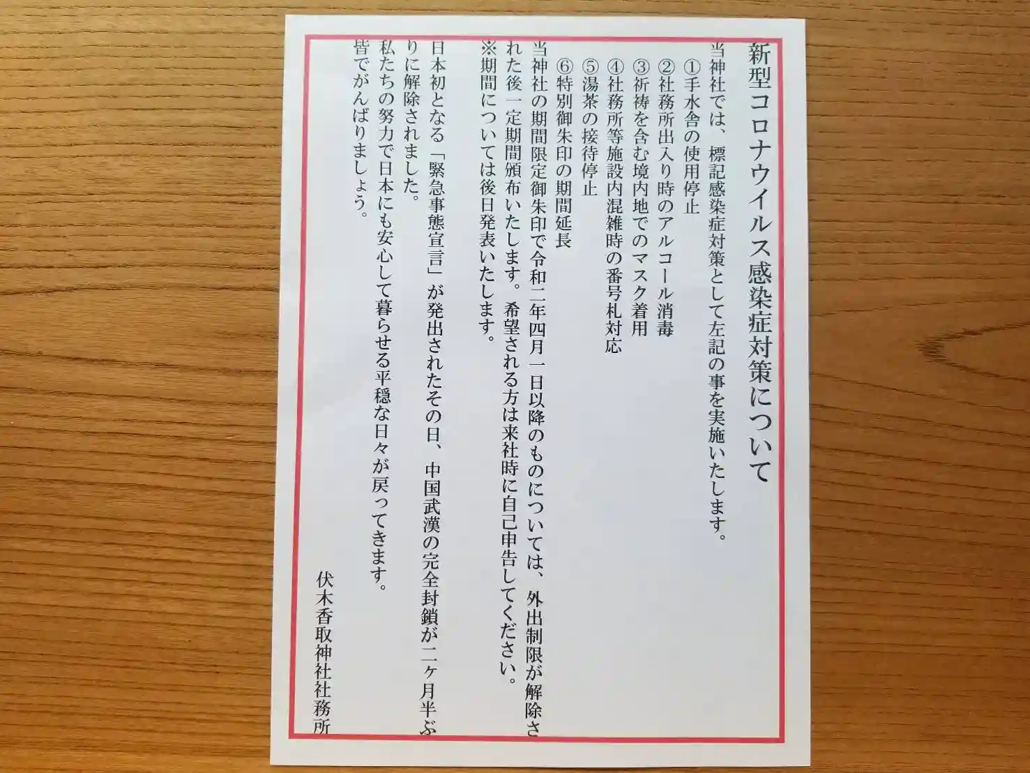 当神社の期間限定御朱印で令和2年4月1日以降のものについては、外出制限が解除された後一定期間頒布いたします。希望される方は来社時に自己申告してください。