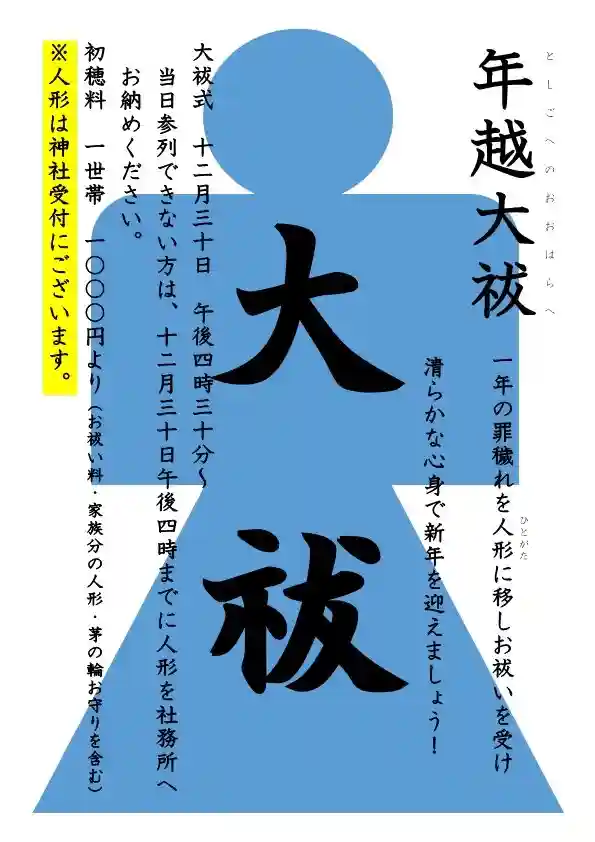 人形(ひとがた)=ご自身の身代わりとなる人形に、一年間の罪穢れを移しお祓いを受け、清らかな心身で新たな年をお迎えしましょう。