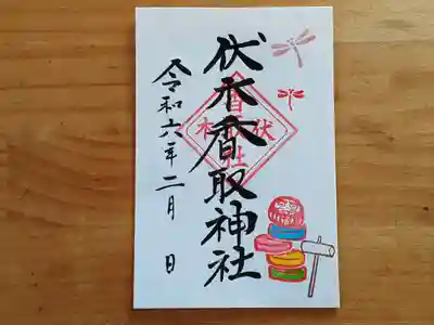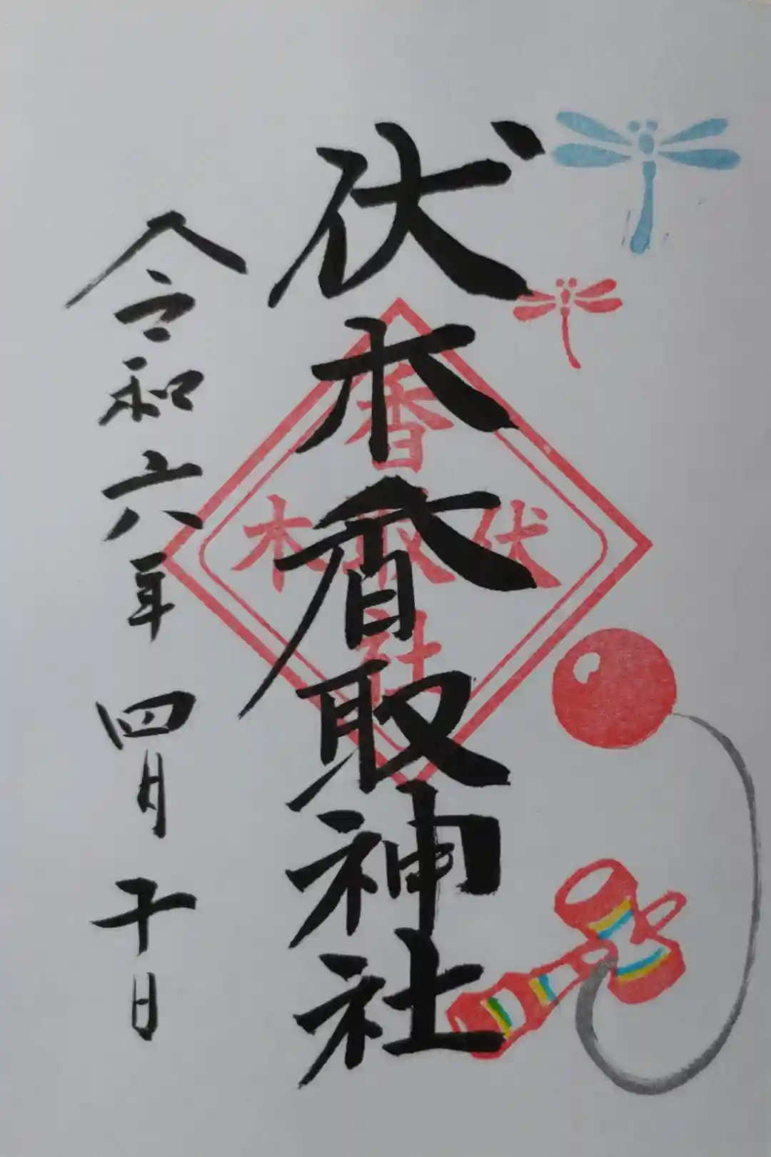 伏木香取神社の勝ち虫(トンボ)月替り御朱印。赤と水色のトンボ、けん玉の絵