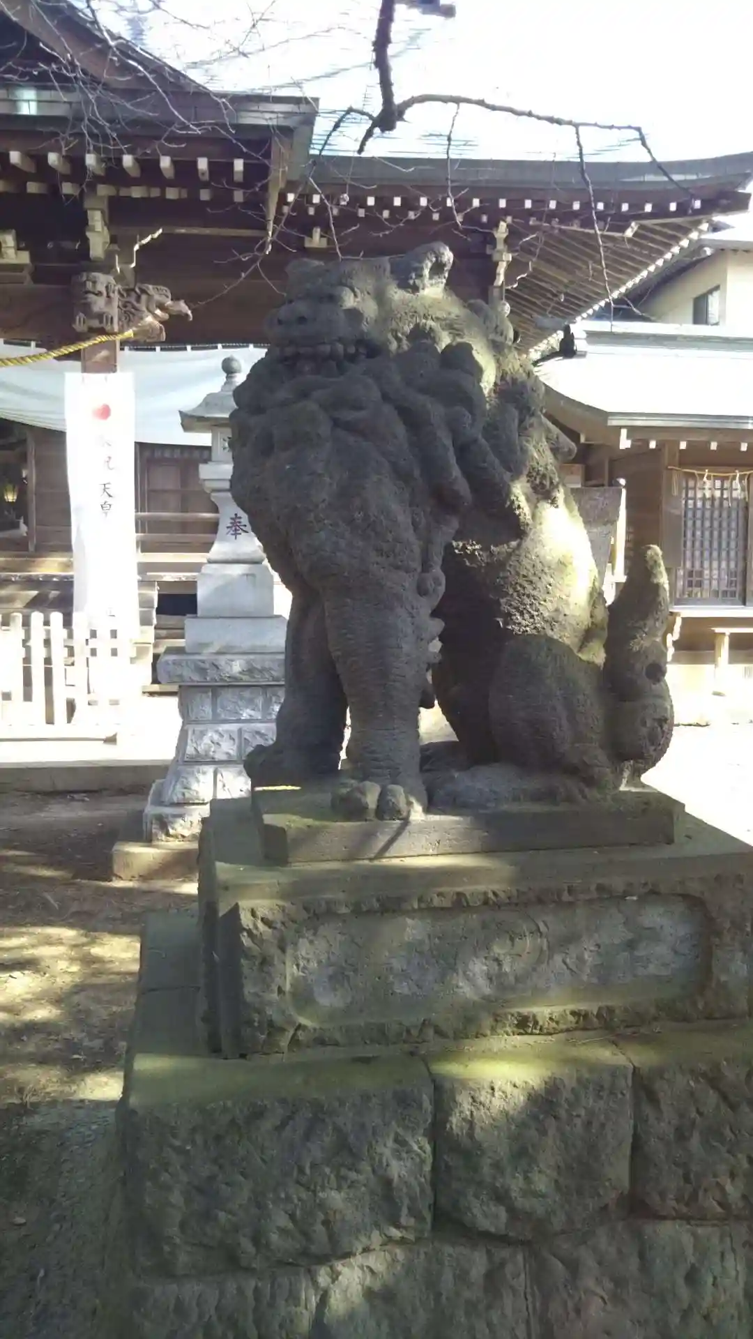 拝殿前の狛犬は、ムックリしている。筋肉と言うよりモフモフしてる。