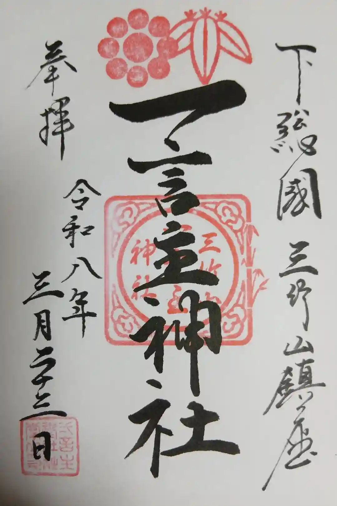 | 御朱印 | あり 右に下総国三竹山鎮座、真ん中に一言主神社と書かれた御朱印です。1月1日から1月15日までの間は、本殿にある鳳凰の彫刻をあしらった新年特別御朱印がいただけます。夏越祭の御朱印もあります。 |