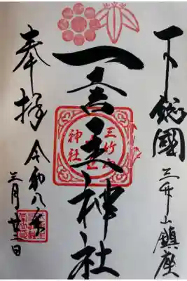 右に下総国三竹山鎮座、真ん中に一言主神社と書かれた御朱印です。1月1日から1月15日までの間は、本殿にある鳳凰の彫刻をあしらった新年特別御朱印がいただけます。夏越祭の御朱印もあります。 | |||