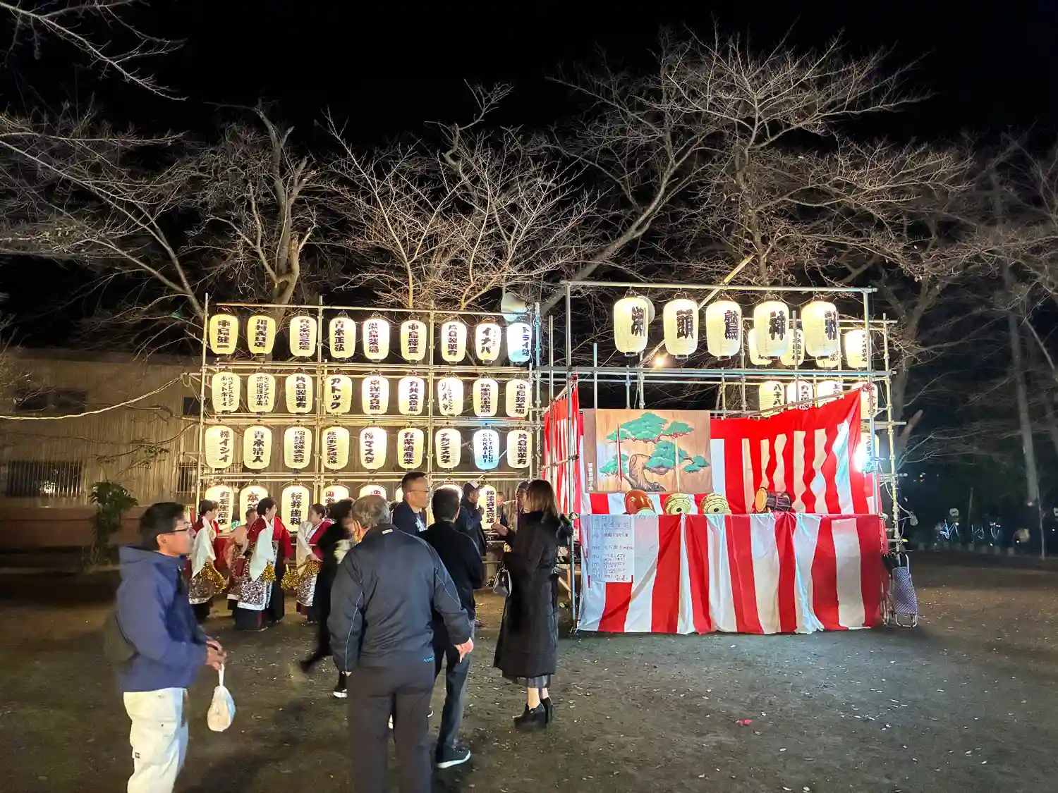 提灯が並んで音楽が聞こえてくる方向に進むと、出店にたくさんのお…
