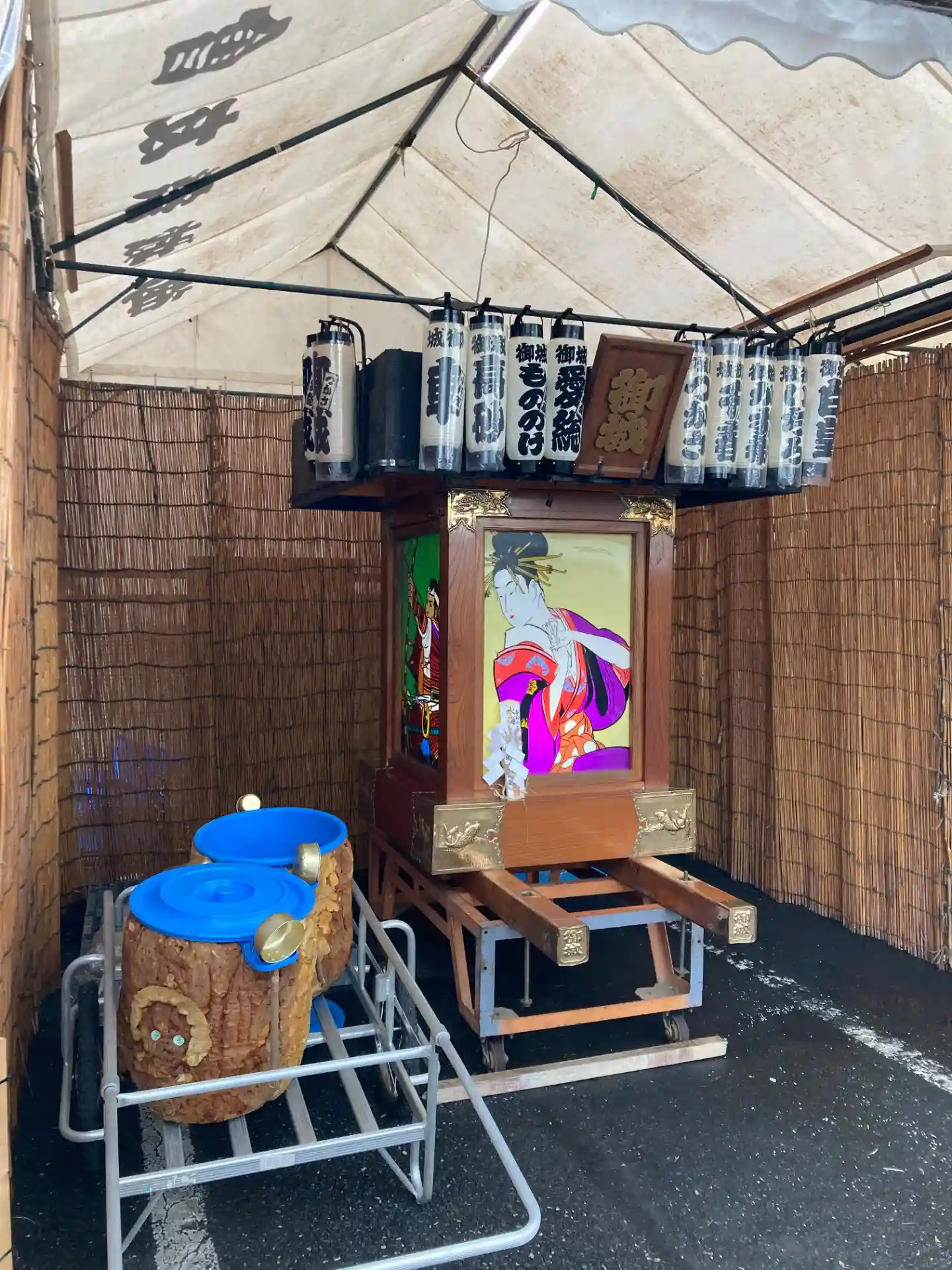 神社の隣接地は神輿が待機中