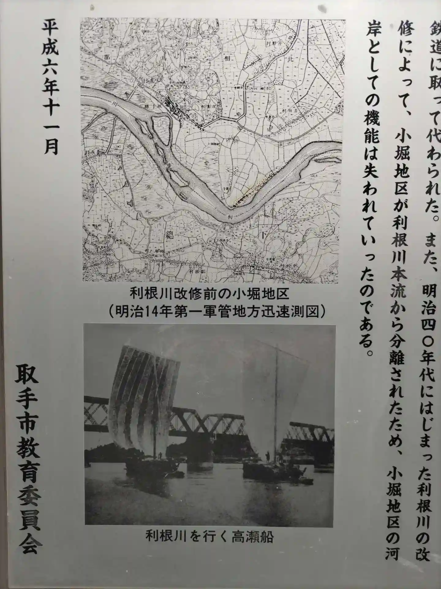 地区内の歴史看板。飛び地の小堀地区がかつて常陸国と陸続きだった説明