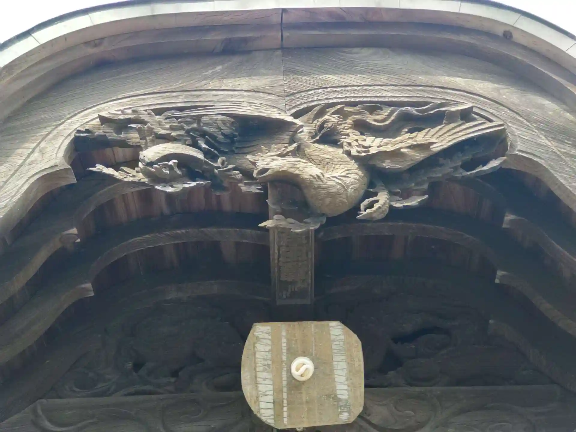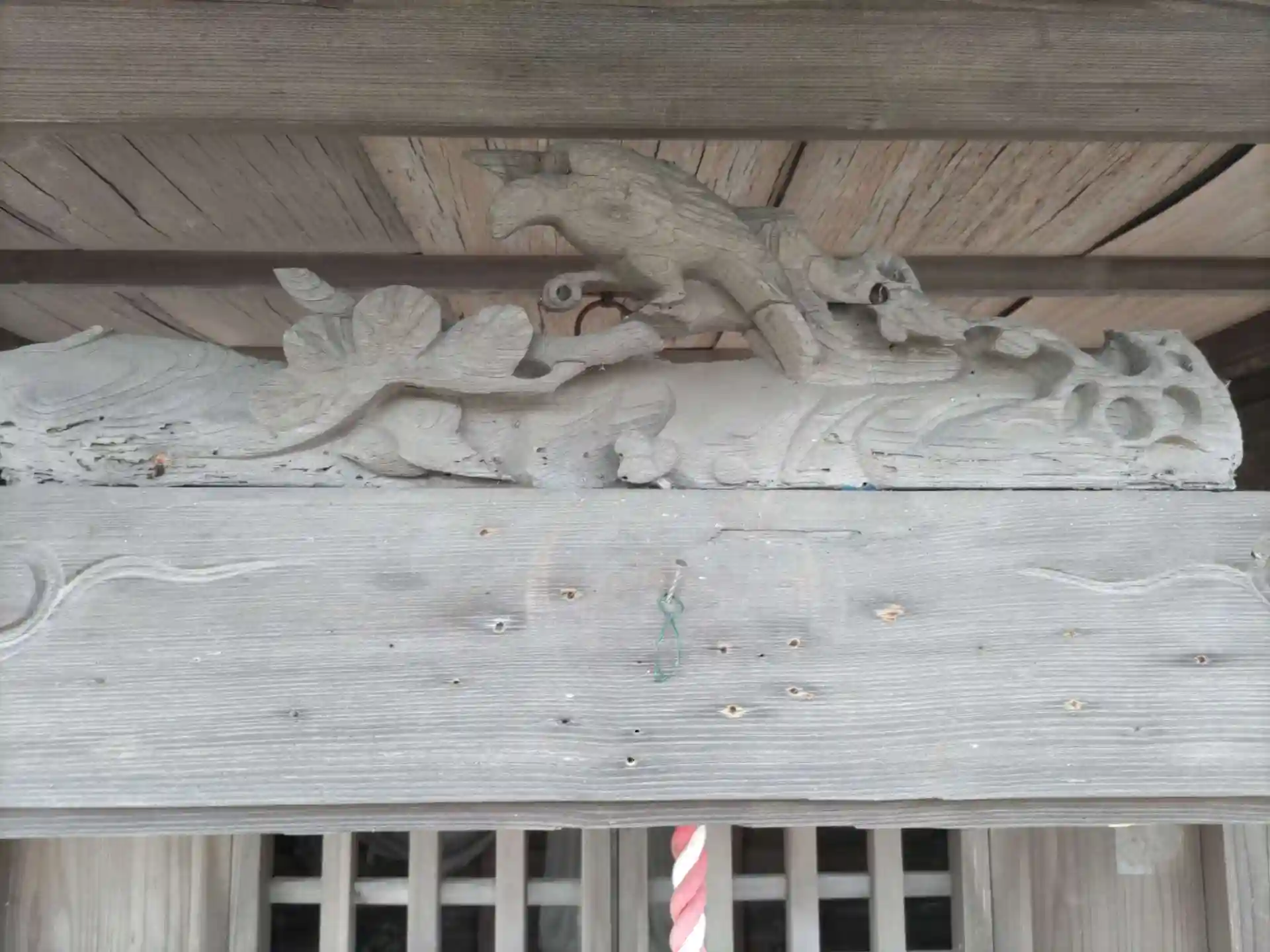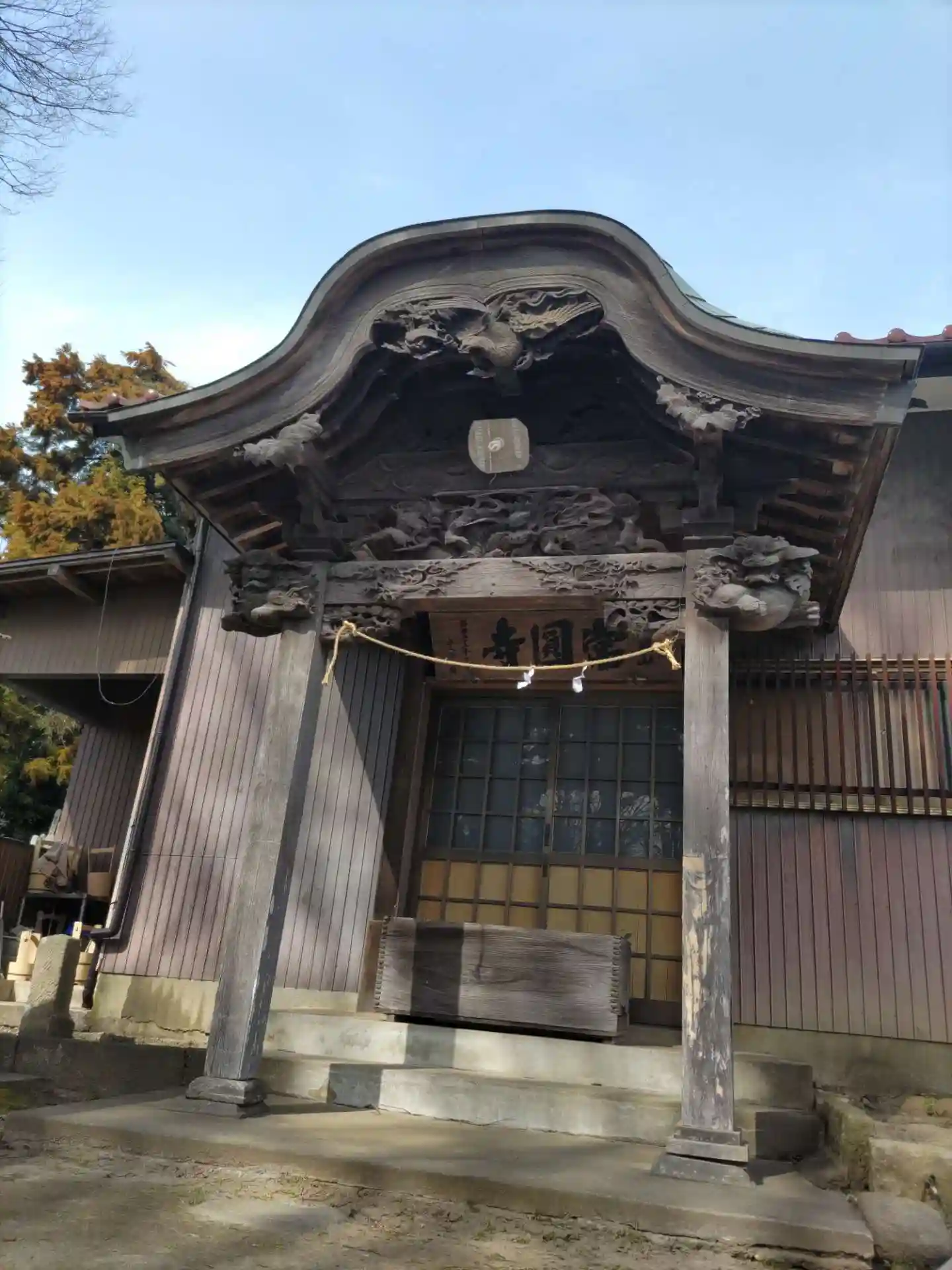 集会所奥がお寺の建築で彫刻がすてき。