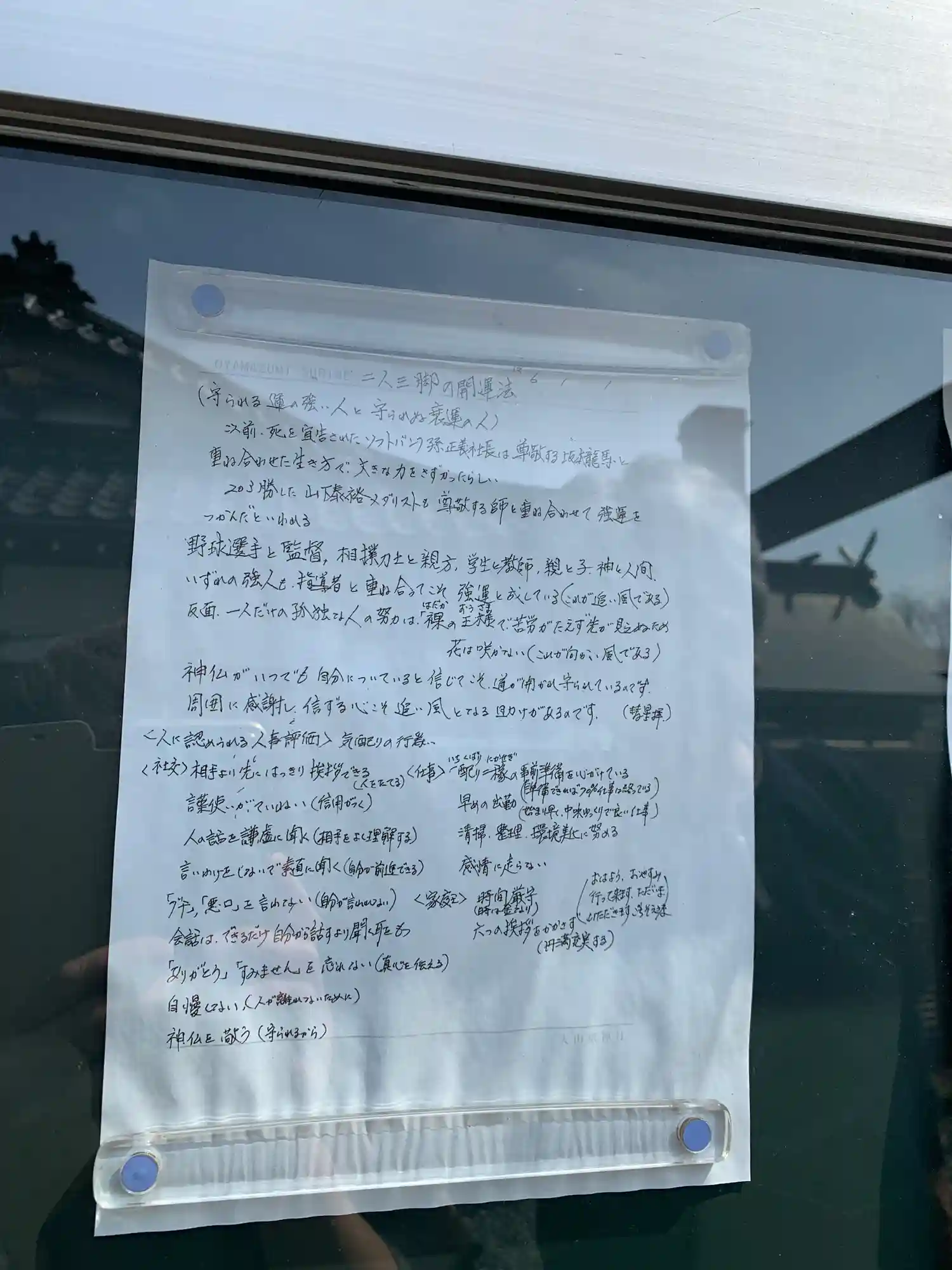 掲示板、ガラスに映るのは除草の方の軽トラ