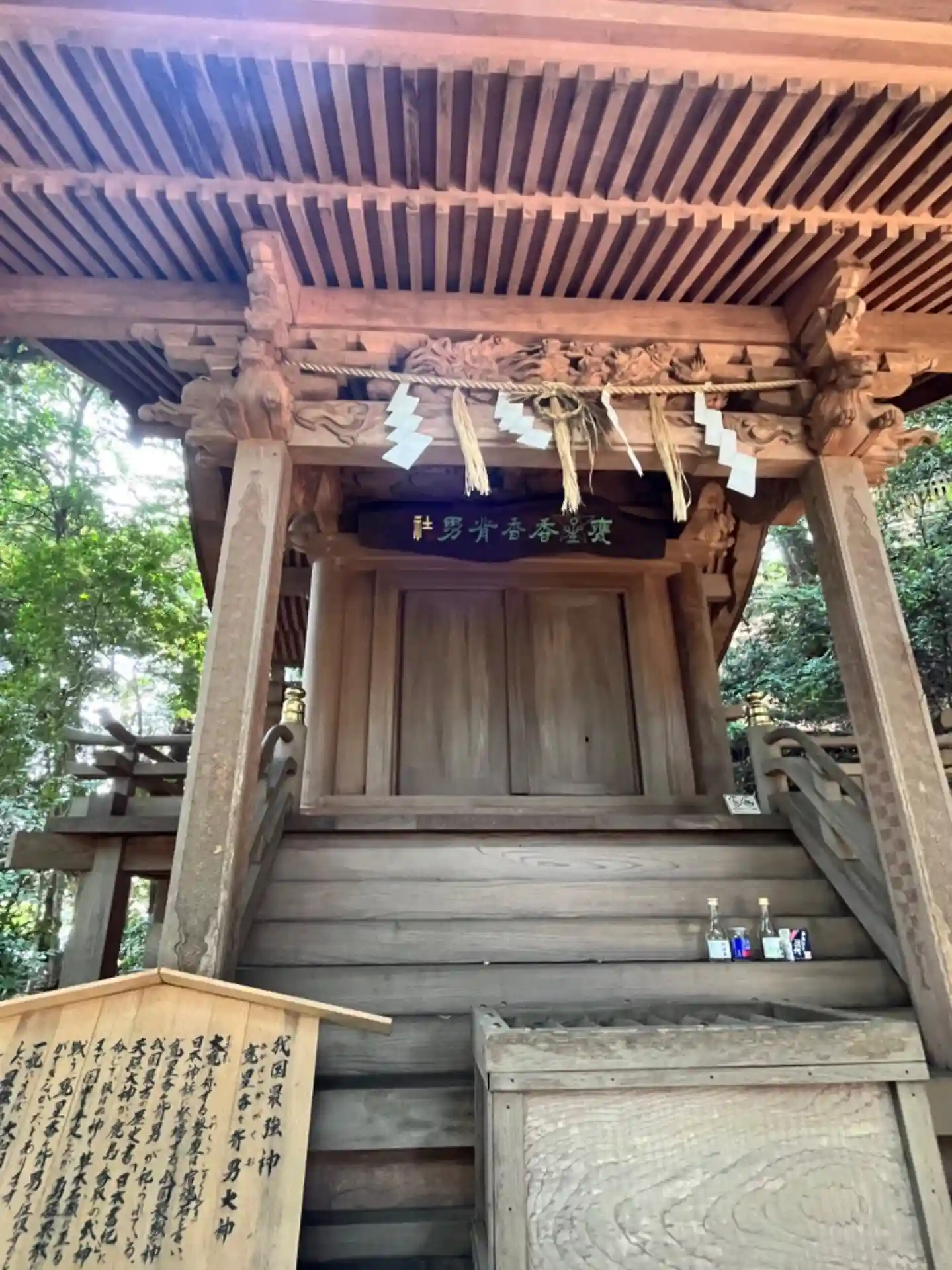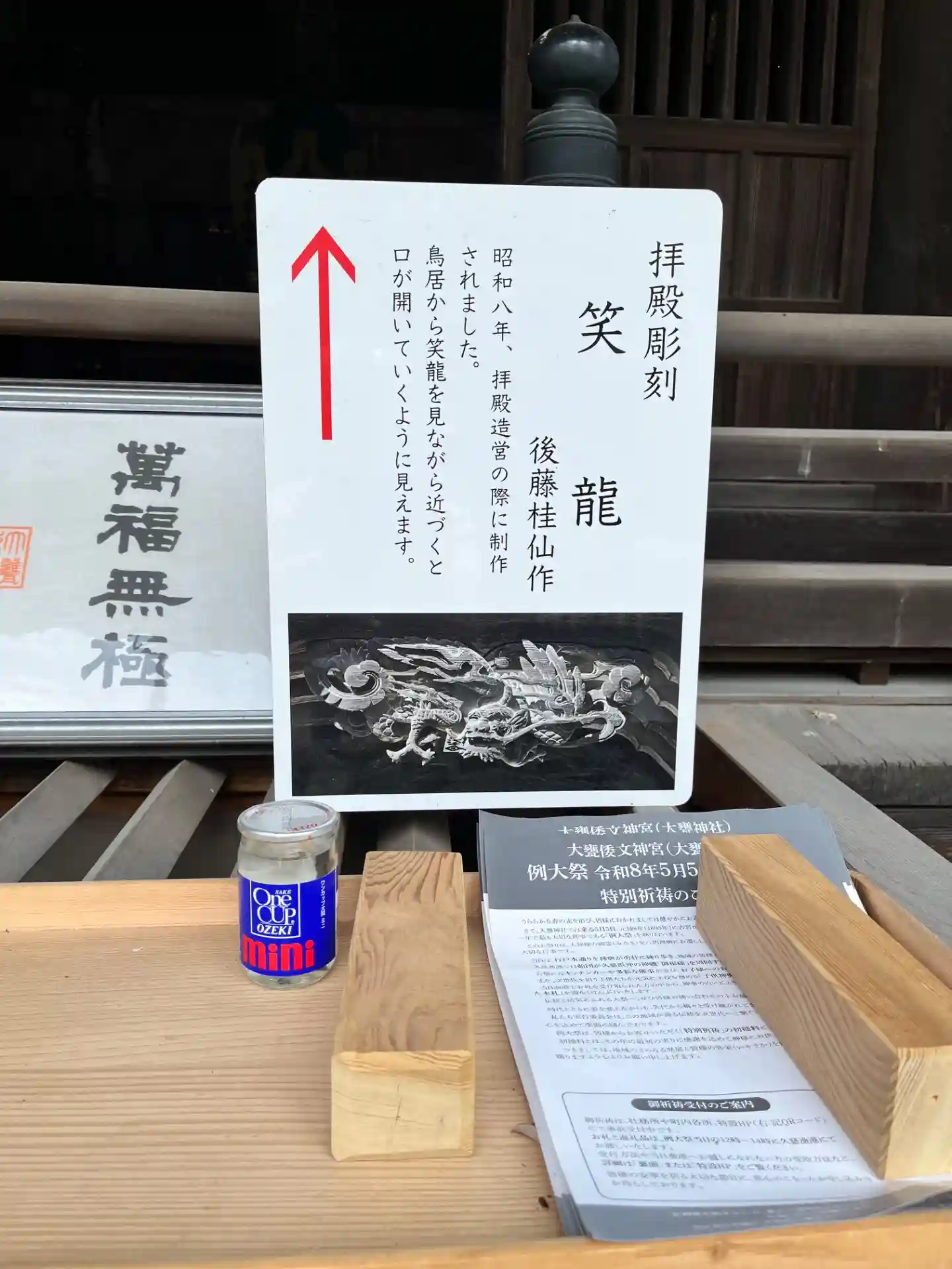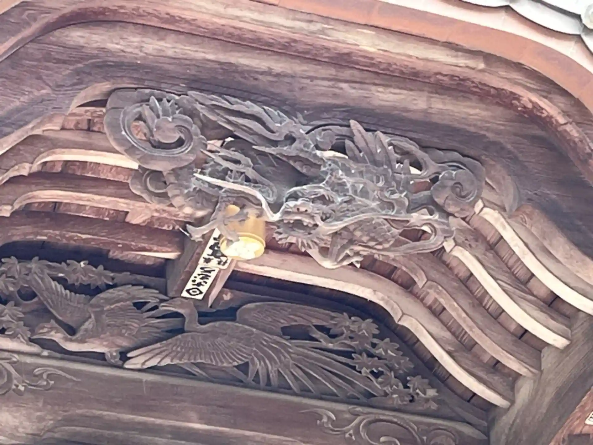 拝殿から本殿に向かいましたが、朝一いきなりロープ(鎖)を使う箇所があるとは、息が上がりました。拝殿彫刻の笑龍ですが、確かに笑って見えました。