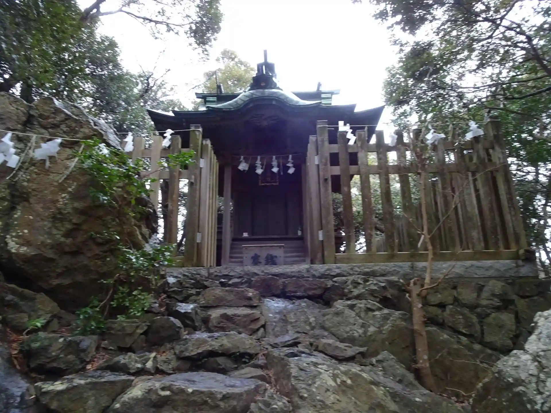 拝殿でお参りし、旧社務所前に「御朱印は、儀式殿に」という案内でそちらに向かおうとすると、末社のそばに本殿参道の文字が・・・。そのまま進むとガレ場からくさり場が。それほど急ではありませんが、それを上ると本殿がありました。