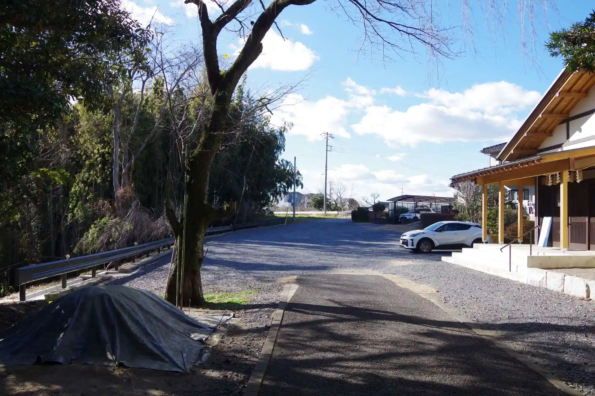 駐車場と社務所、左側に簡易トイレが有ります。