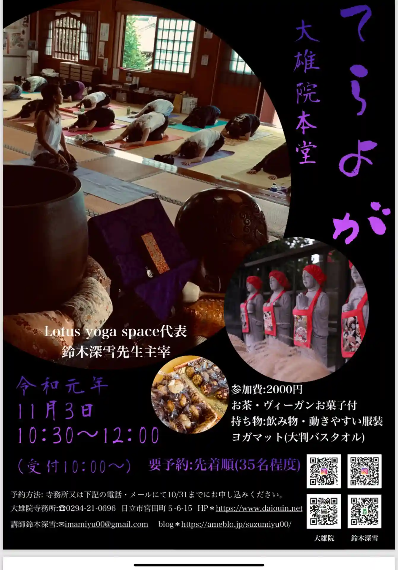 寺YOGA第二回のお知らせです。前回大好評ですぐに定員となりました鈴木深雪先生のヨガイベントです。