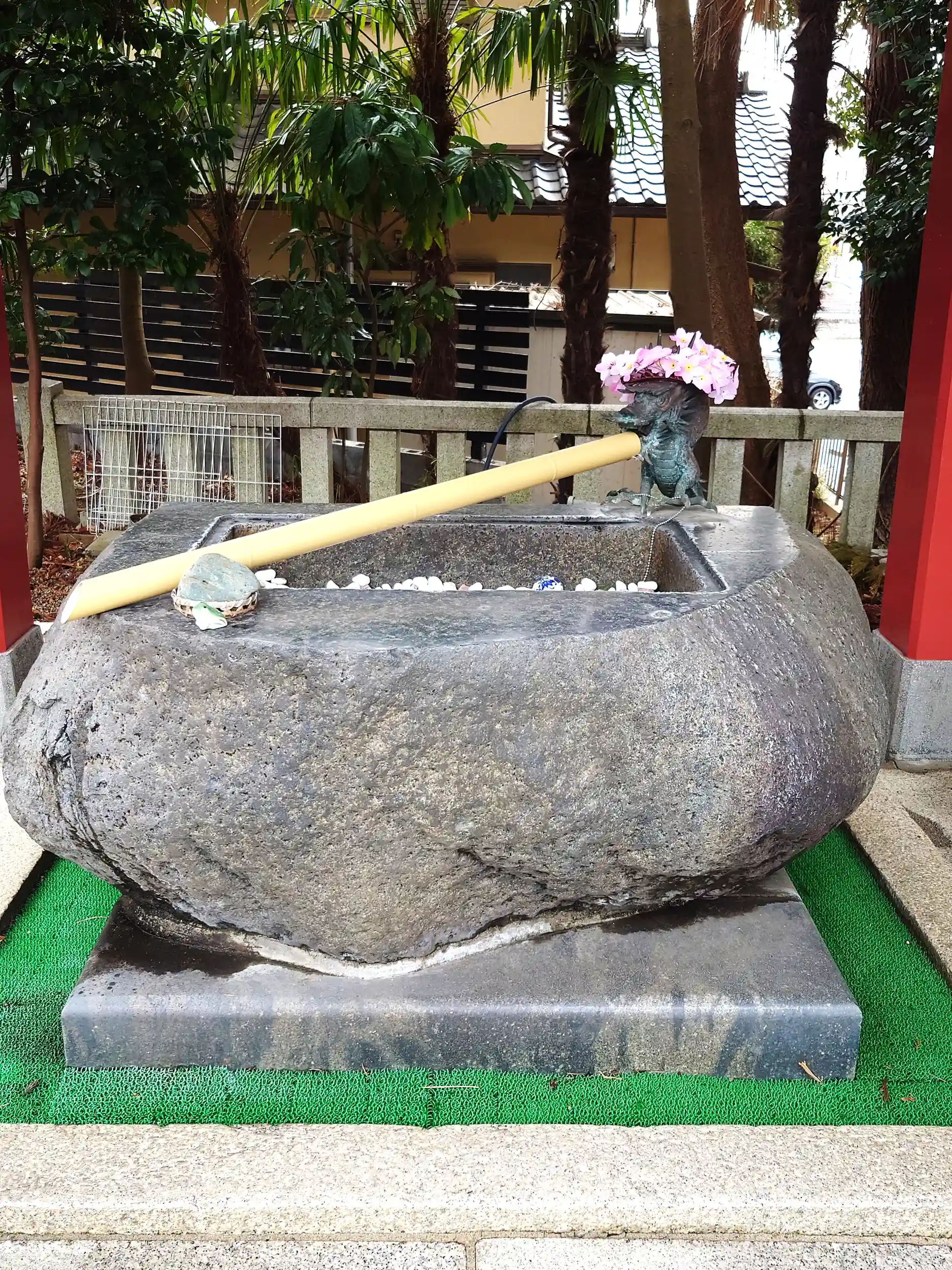 花の首輪をしている狛犬さん