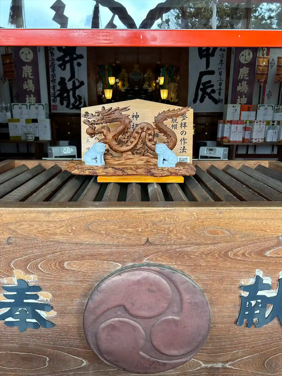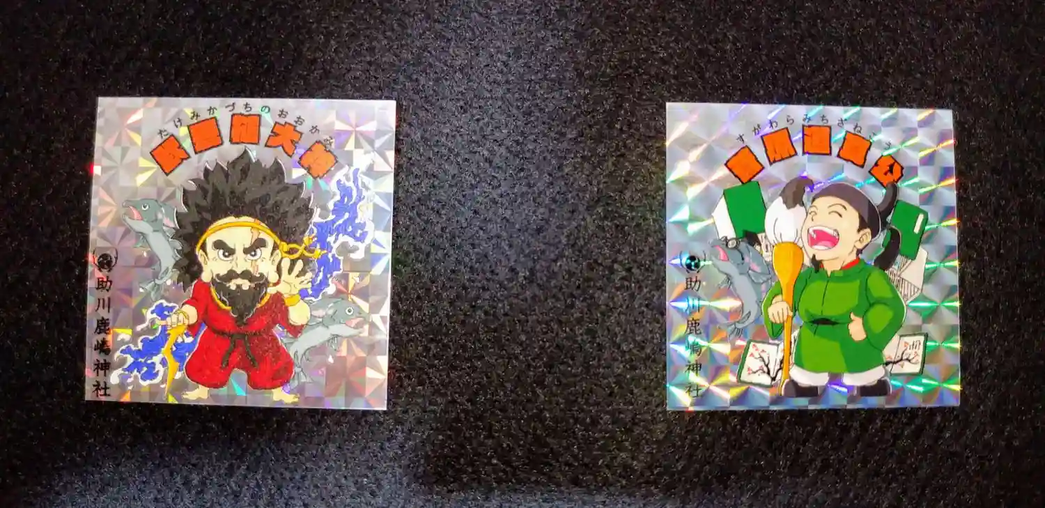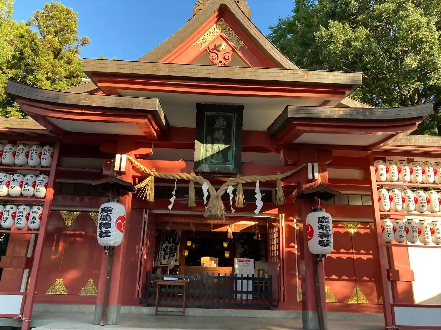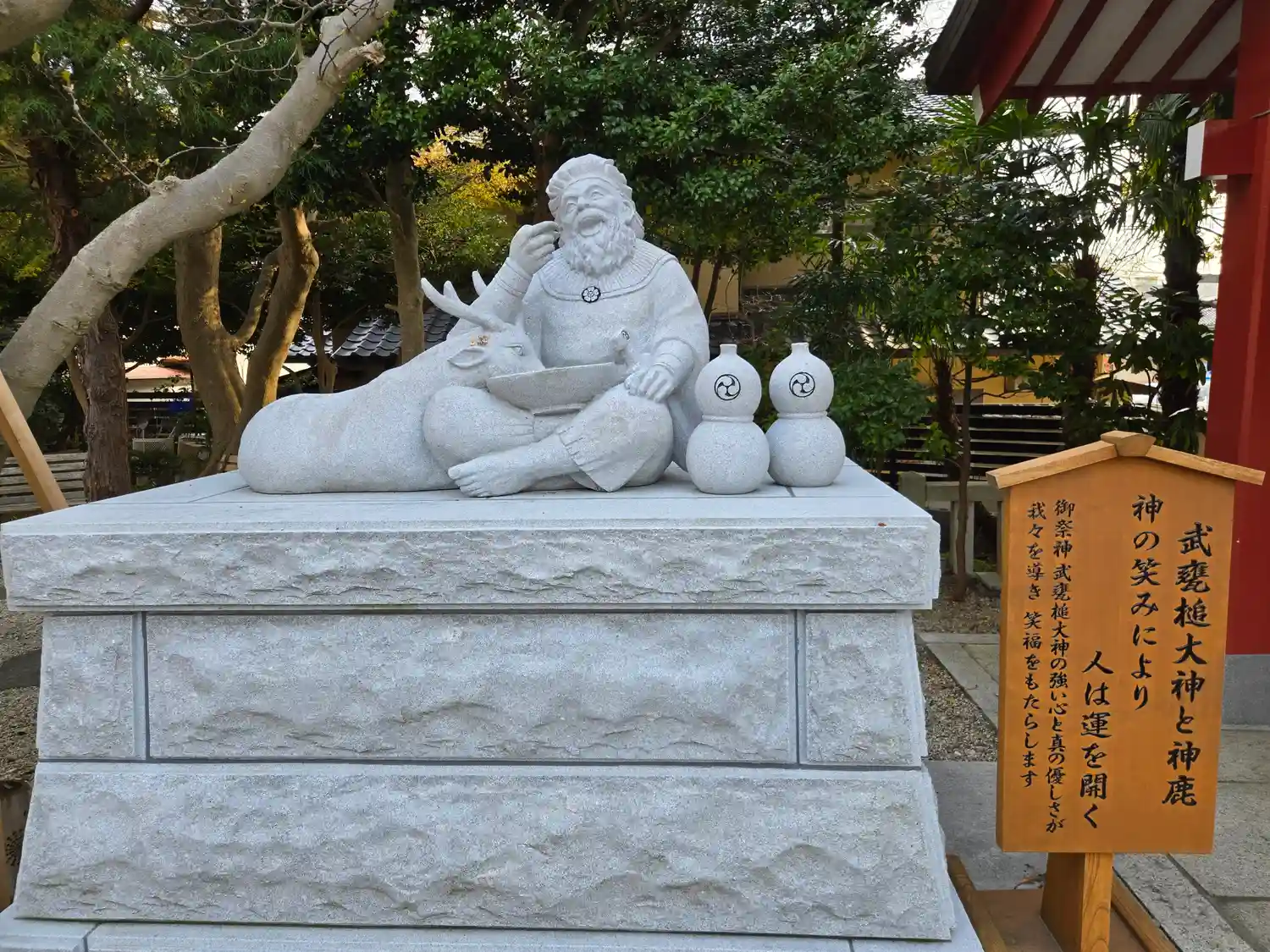 朱色の御社殿に、笑顔の武甕槌大神。
