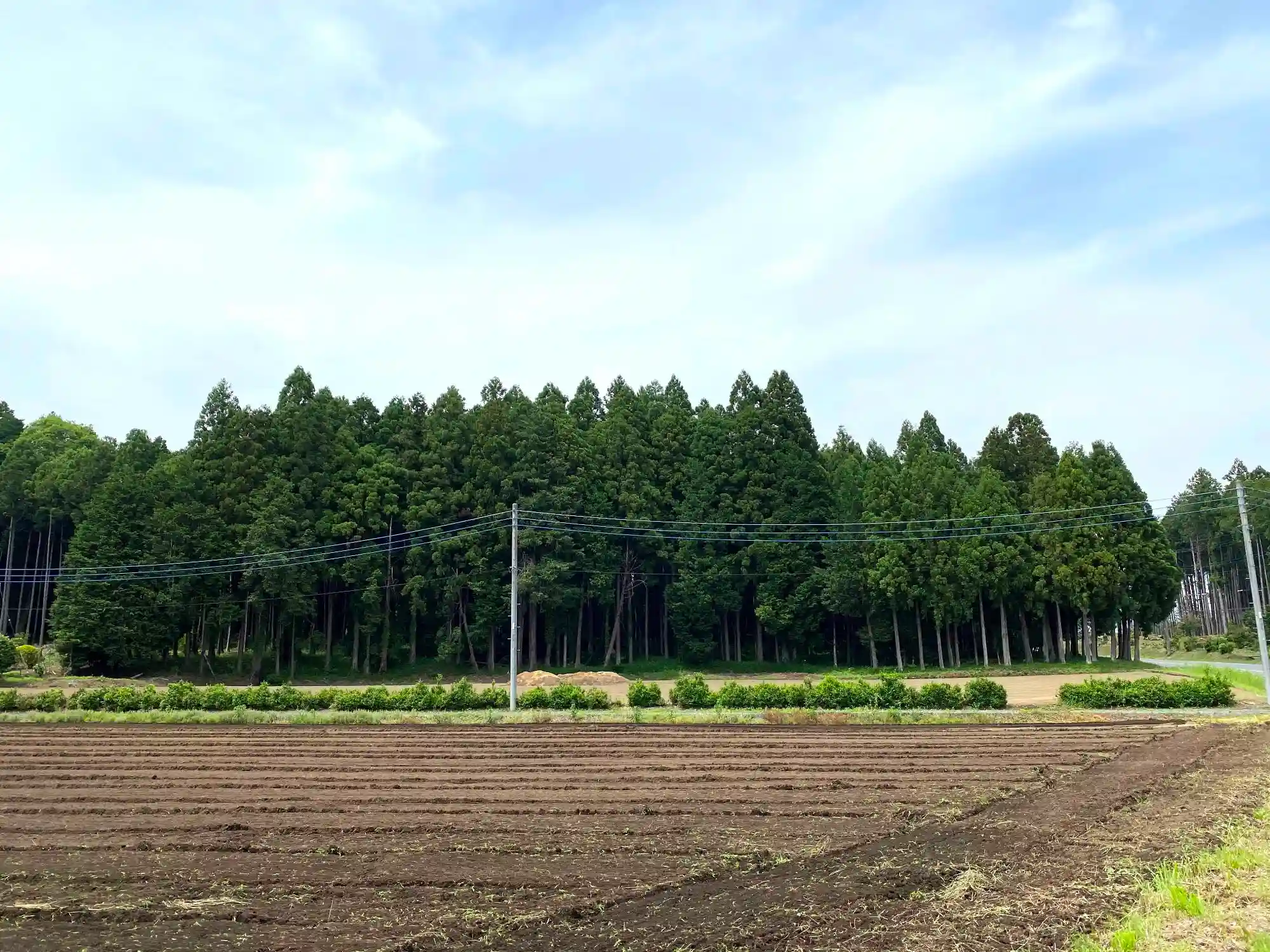 境内脇を走る幹線道路から、参道右側の畑と、社殿のある社叢を望む。