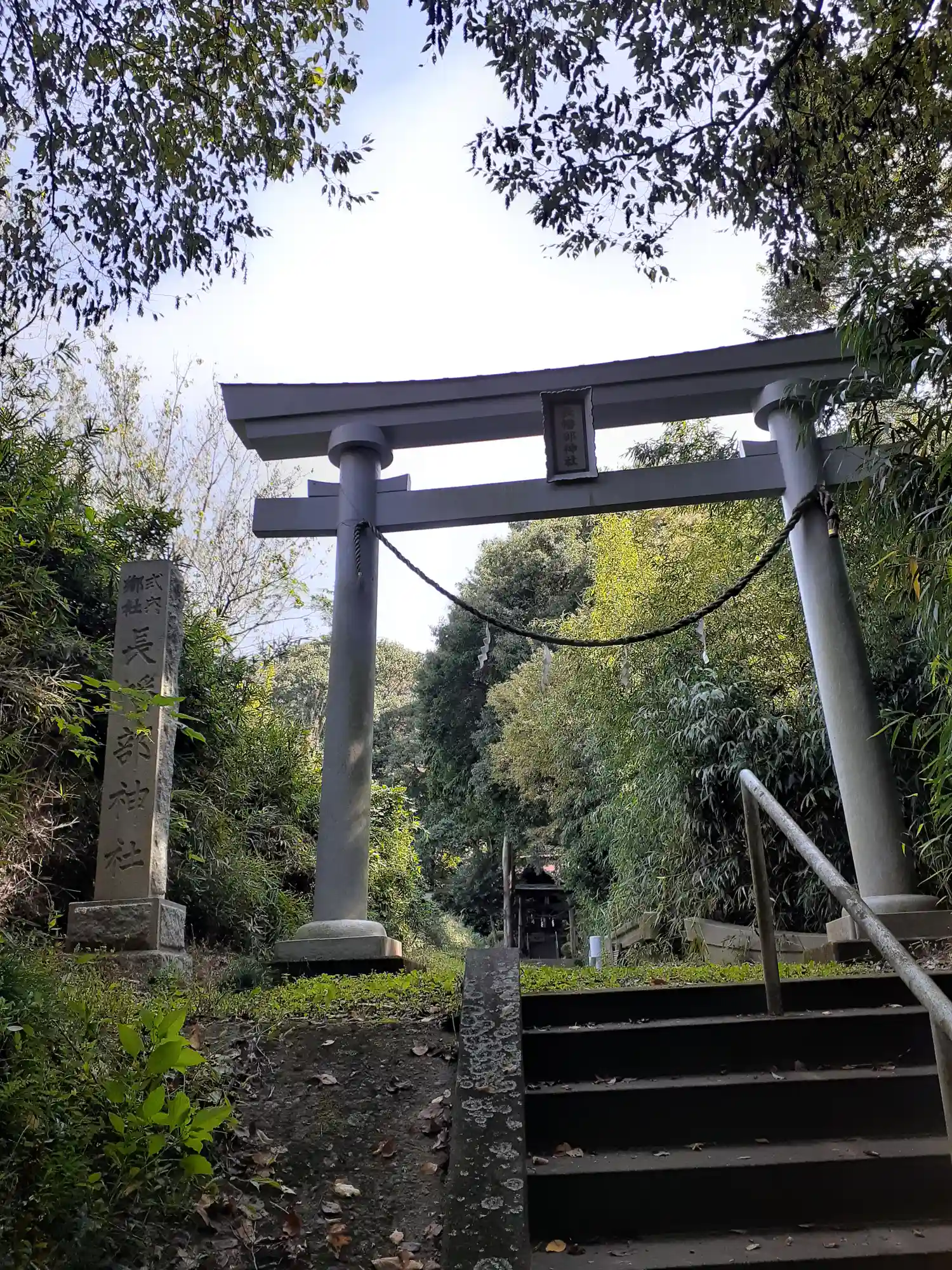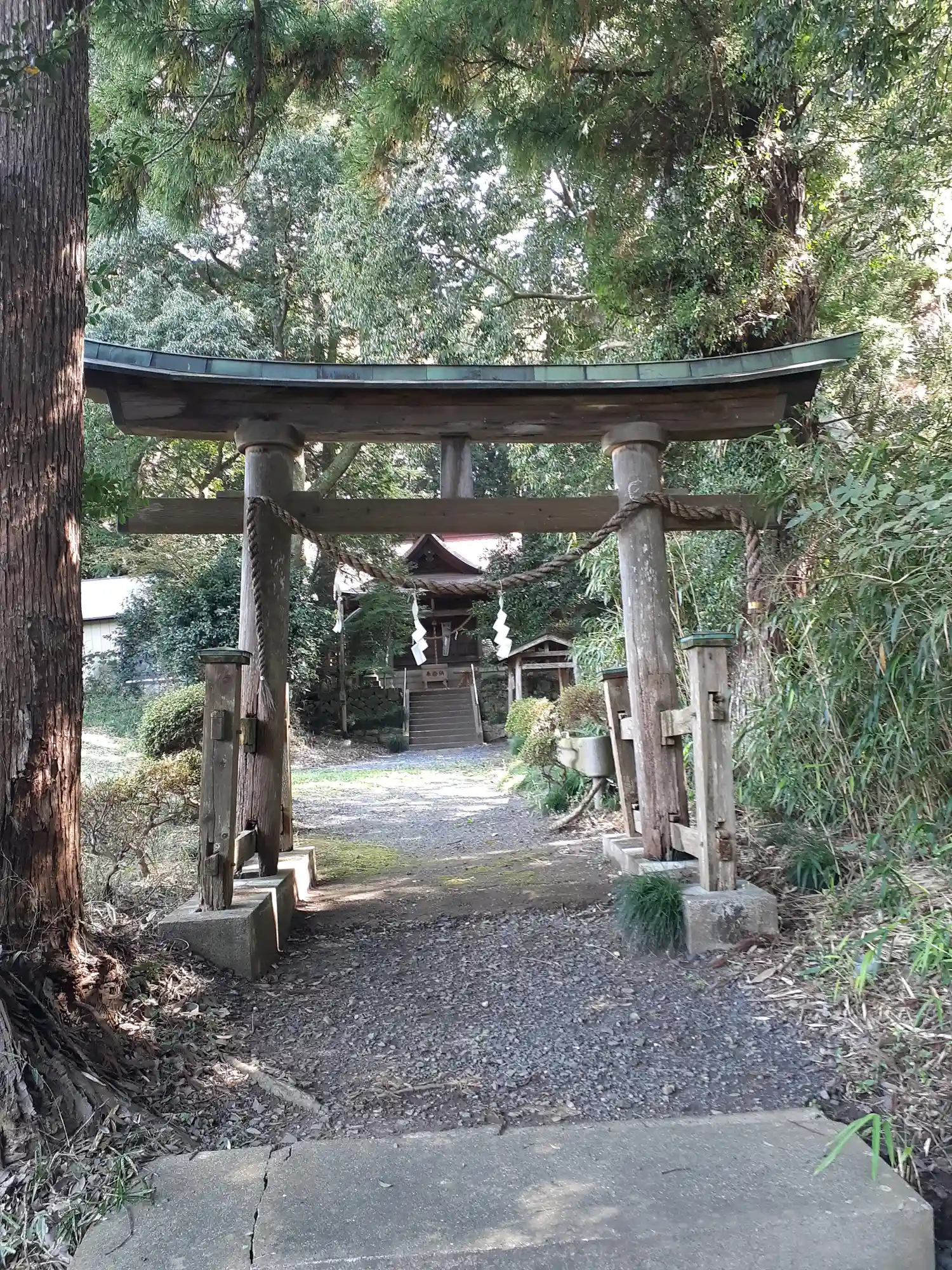 集落から山へ続く道を登ると、大判の石段が始まり、明るい日差しで異世界感を味わいながら歩くと一の鳥居…