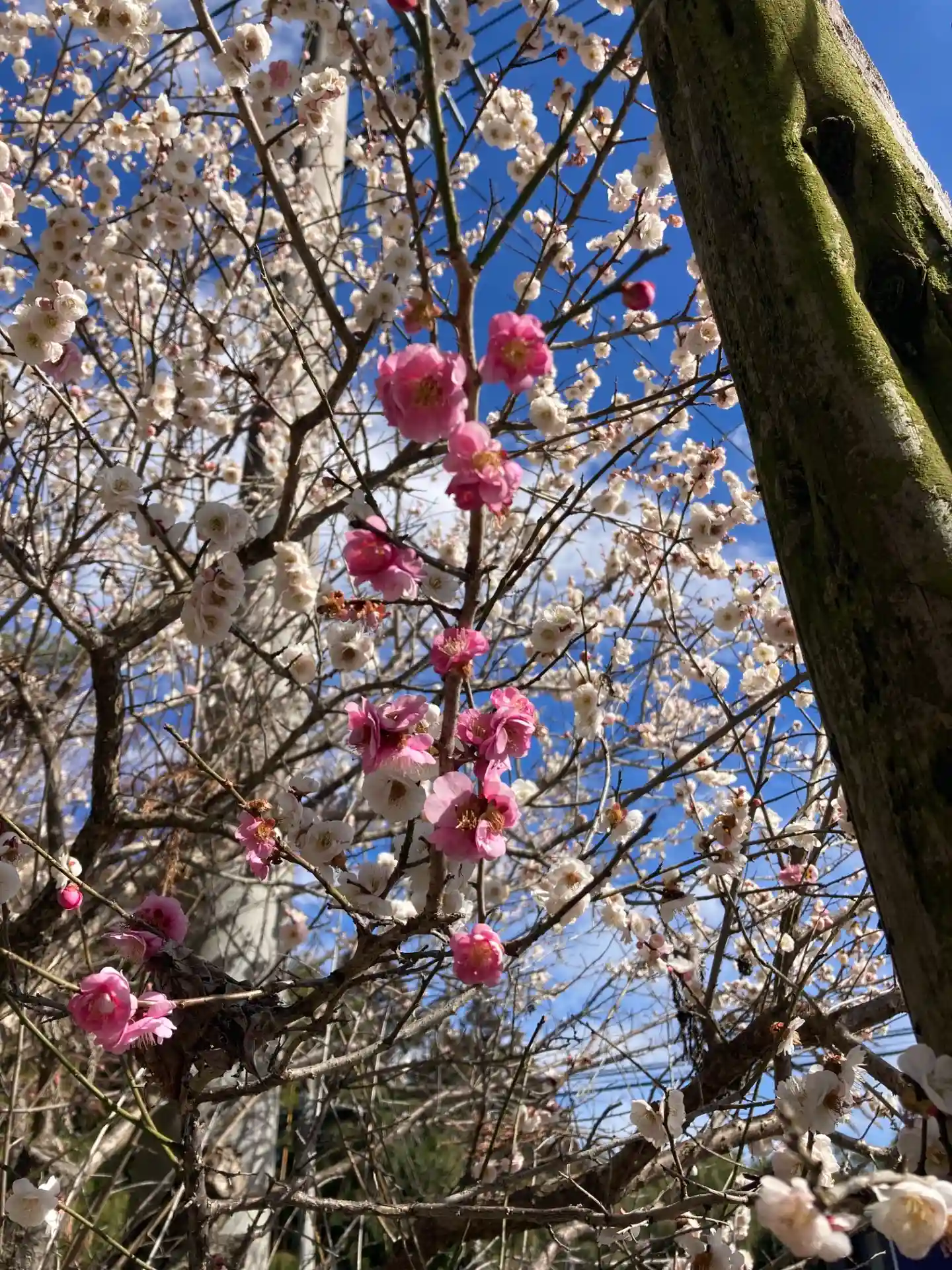 鳥居前には梅の花が満開で、温かな日差しの中、参拝してきました。写真を撮りましたが、白い花の木に、赤…