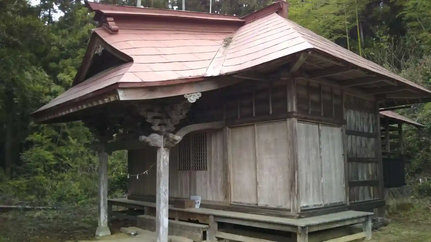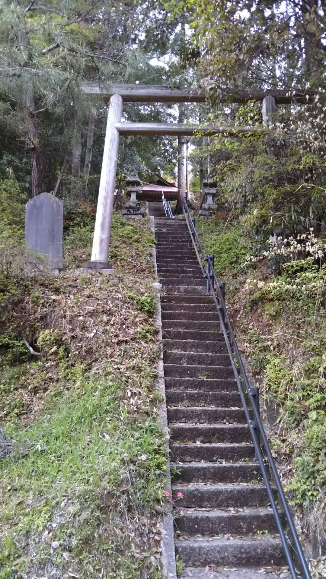集落センターの敷地の端に鎮座しています。階段は急なので気をつけて下さい。扁額は、彫刻刀で掘ったような印象を受けました。