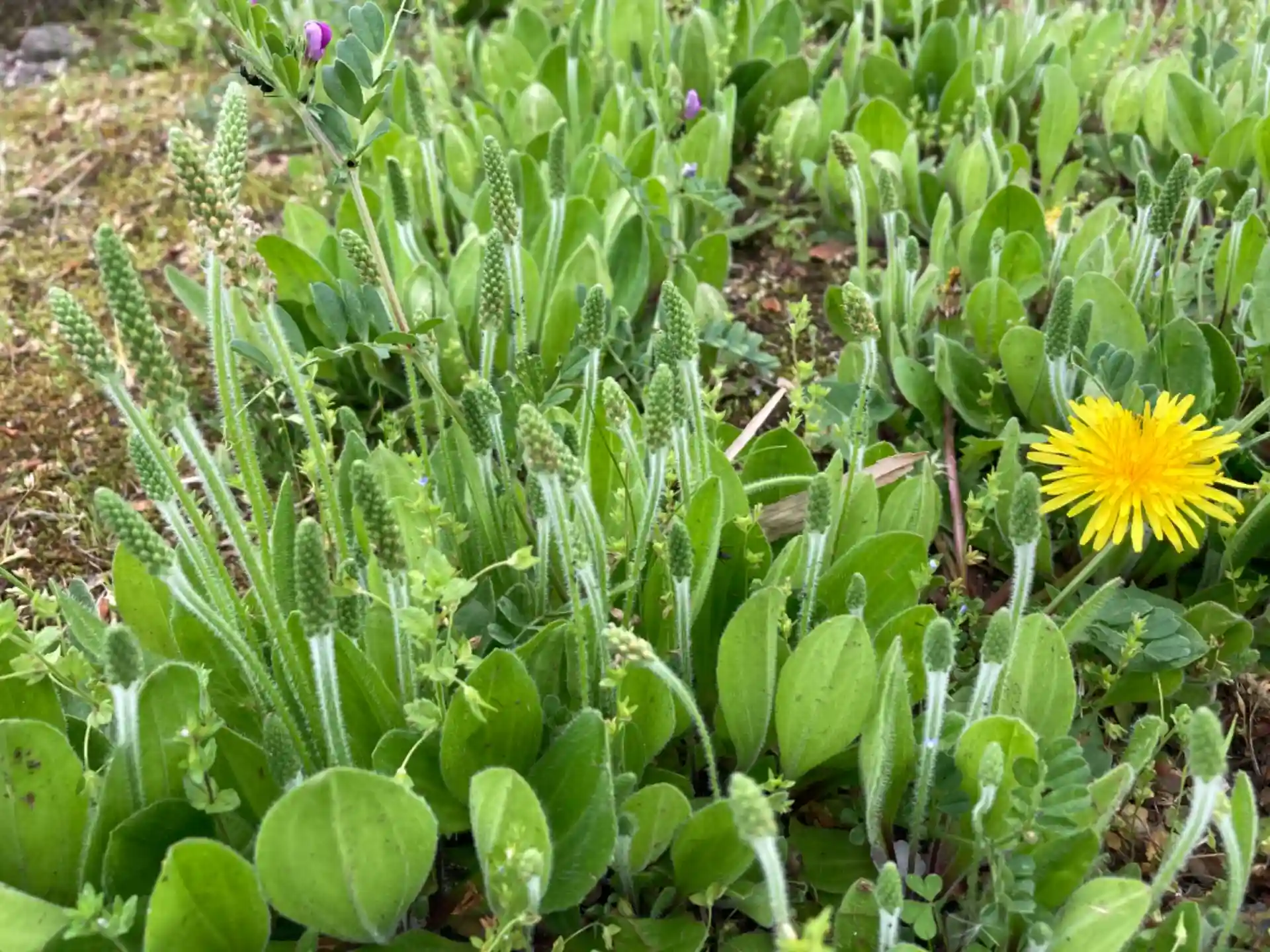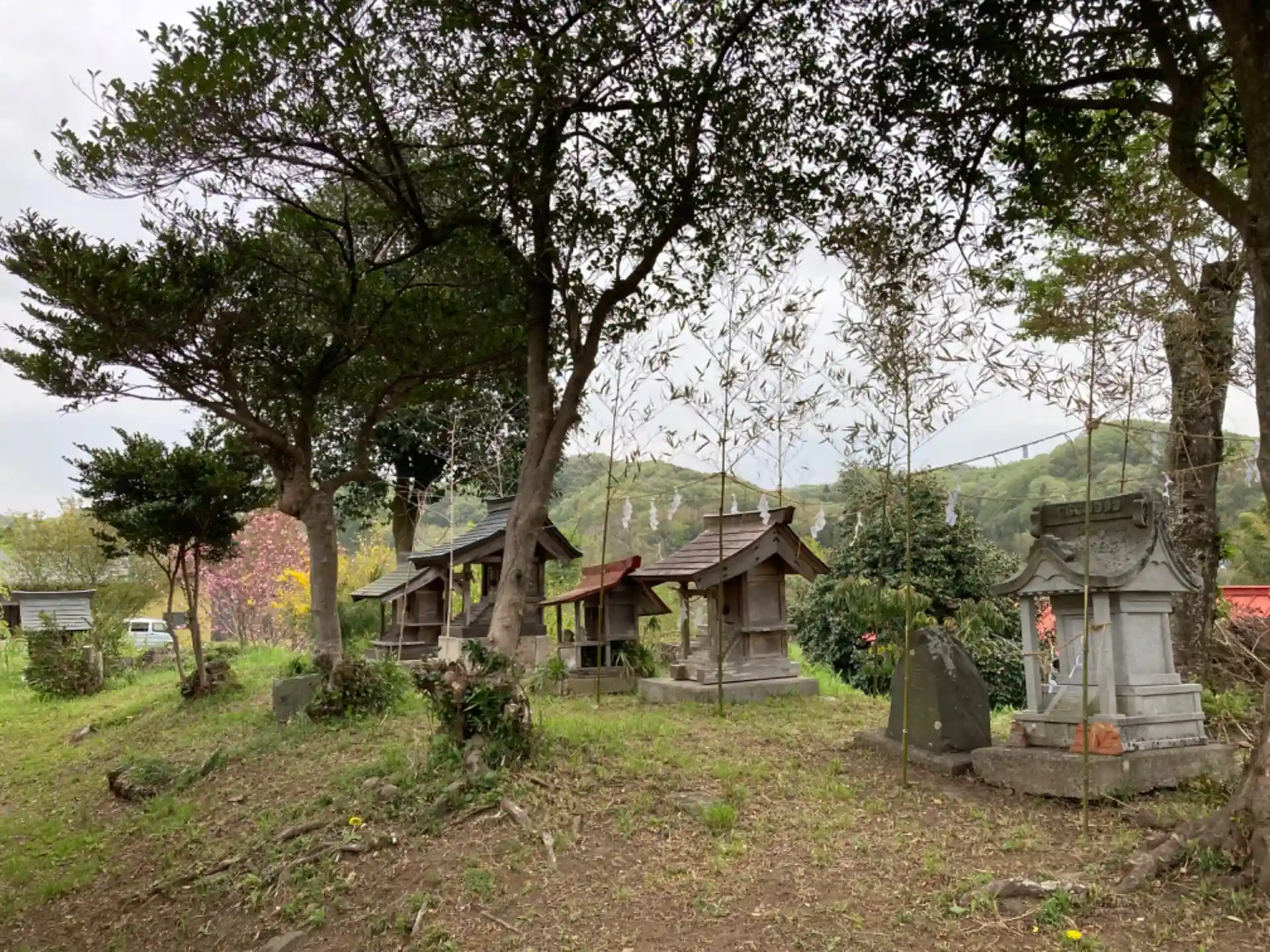 道路脇に鎮座する拝殿を持たない神社です。参道はたんぽぽや柔らかそうな草に覆われて、歩くのが忍びない気持ちになりました。