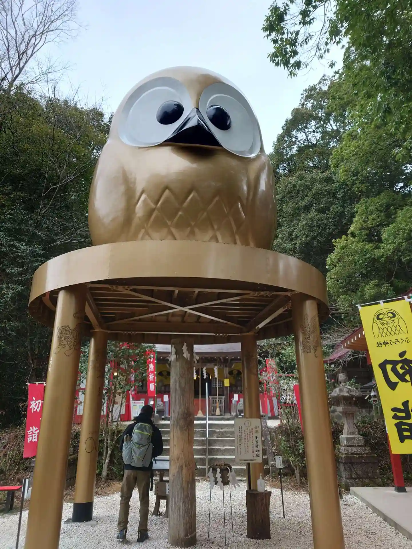 階段の先に巨大フクロウ。その先に本宮があります。