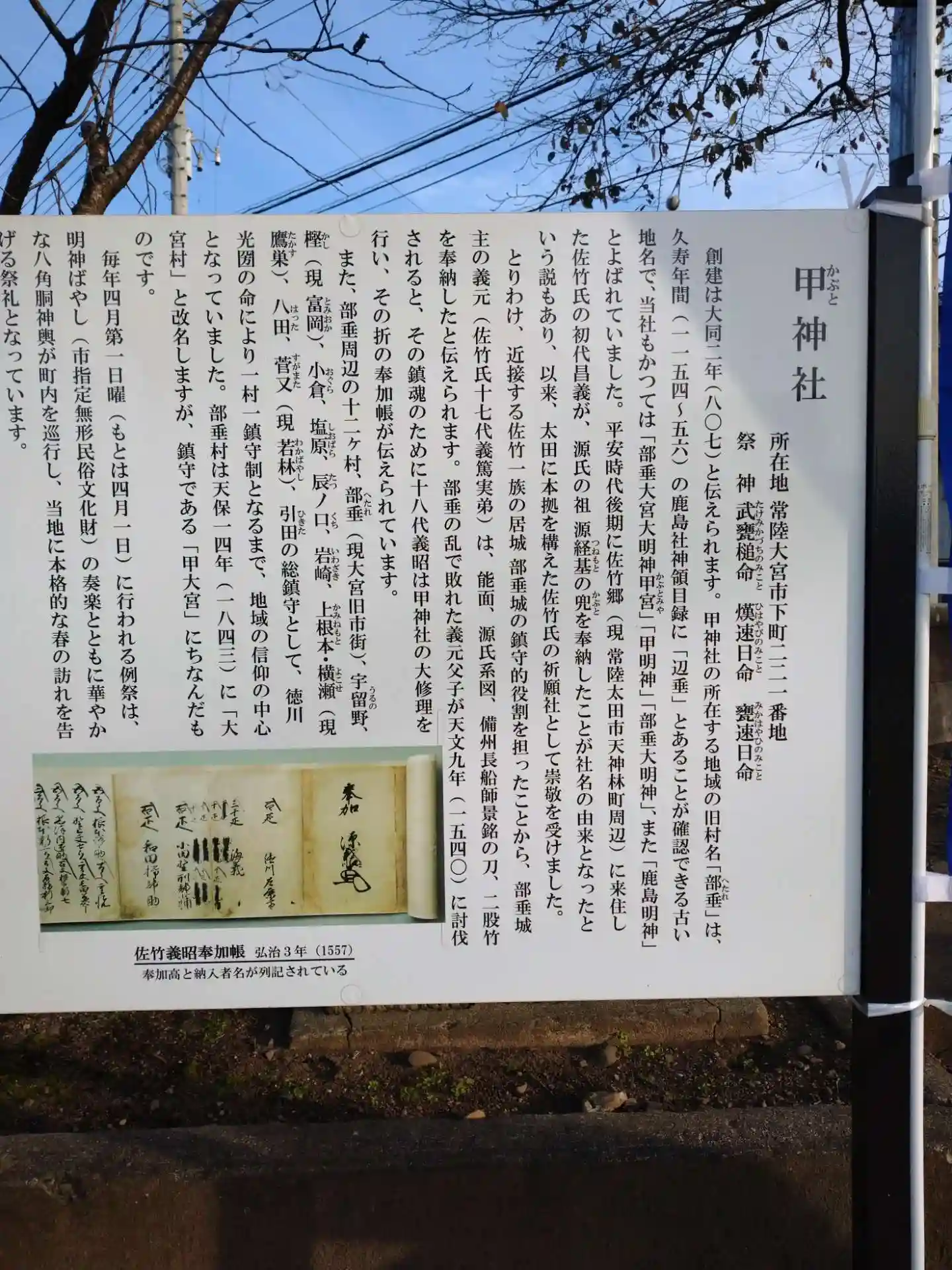立野神社の次は近くにある江畔寺で花の寺めぐりのスタンプを押し、集中曝涼の「西塩子の回り舞台」を拝観した後に、大宮エリアに戻って甲神社に参拝しました。
