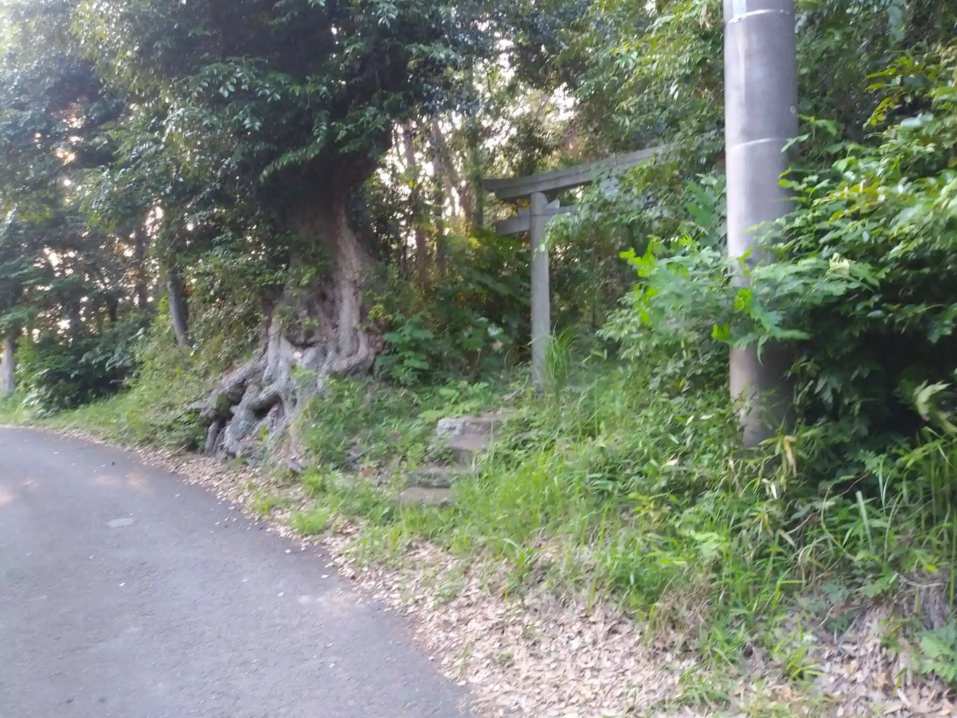 鳥居横には椎の大木が根を張っています。
