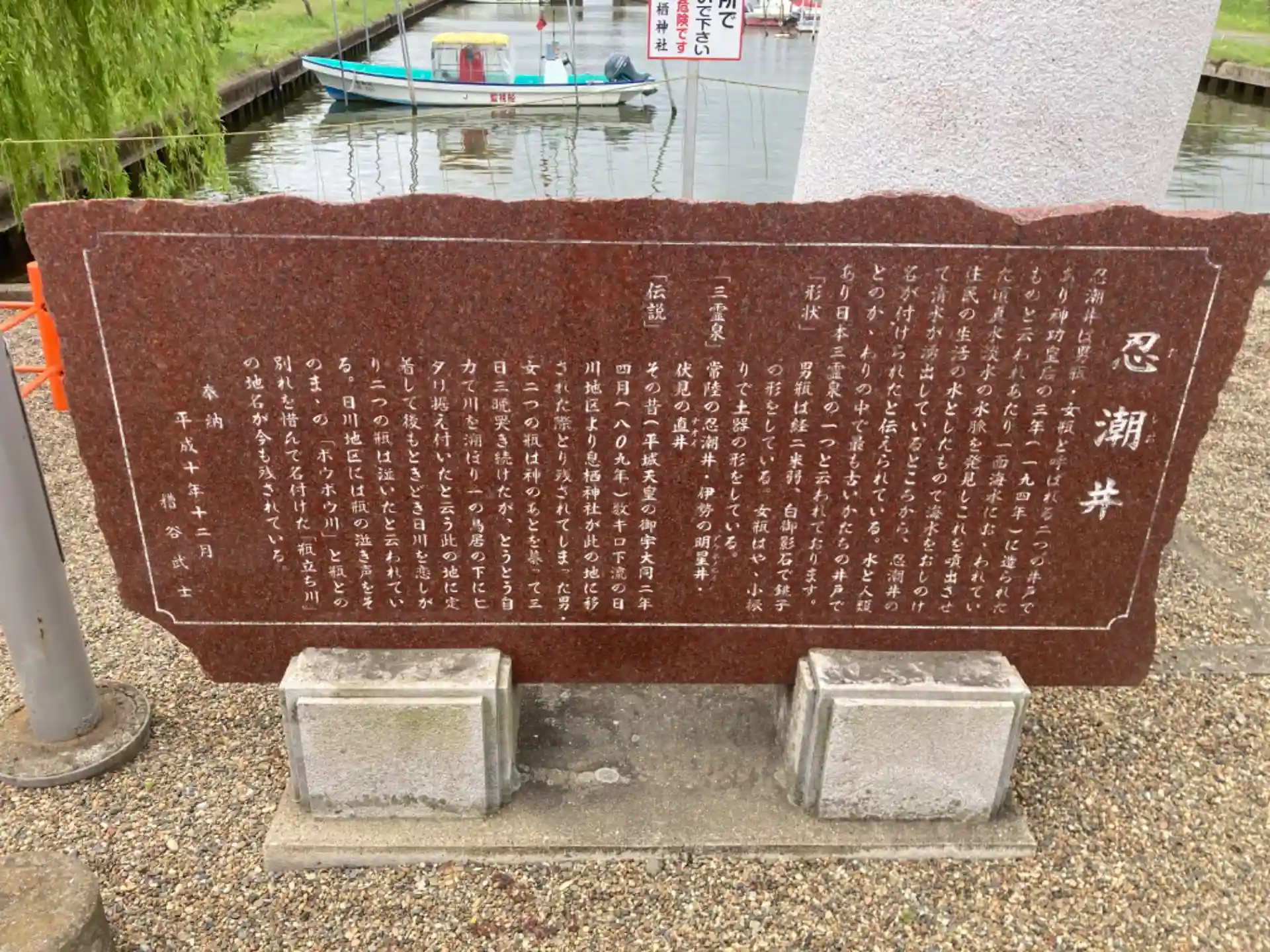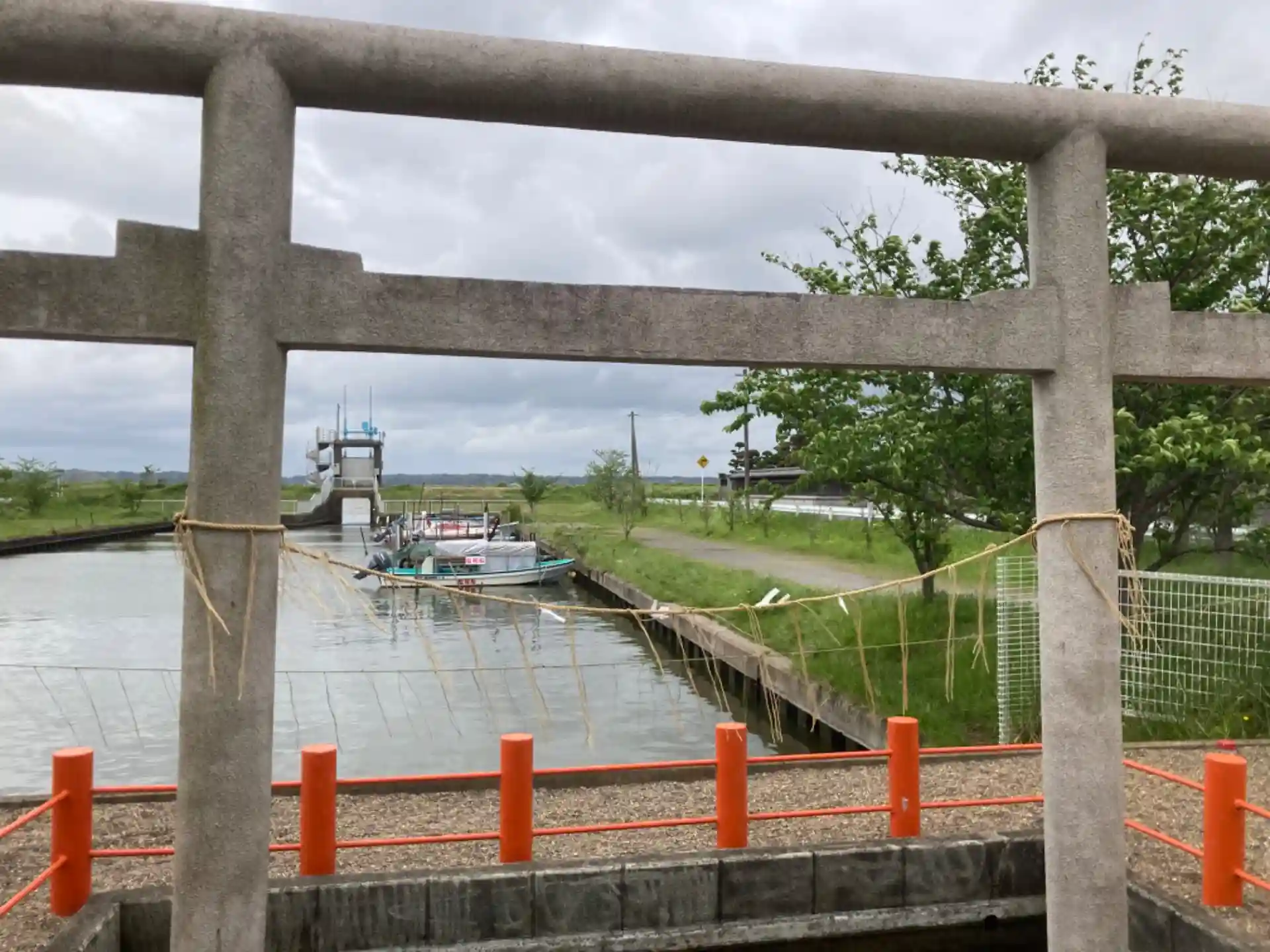 利根川の支流の辺に立てられた大きな鳥居があり、その支柱の両側に、小さな鳥居が立てられていました。