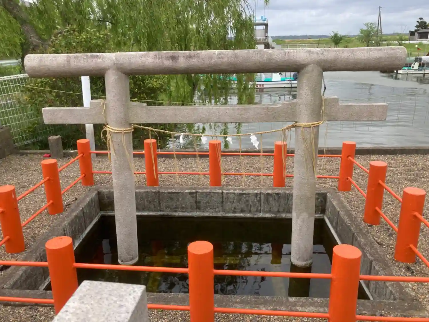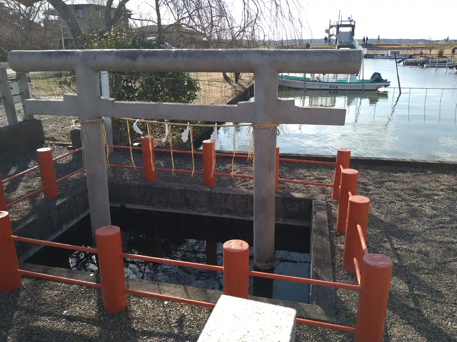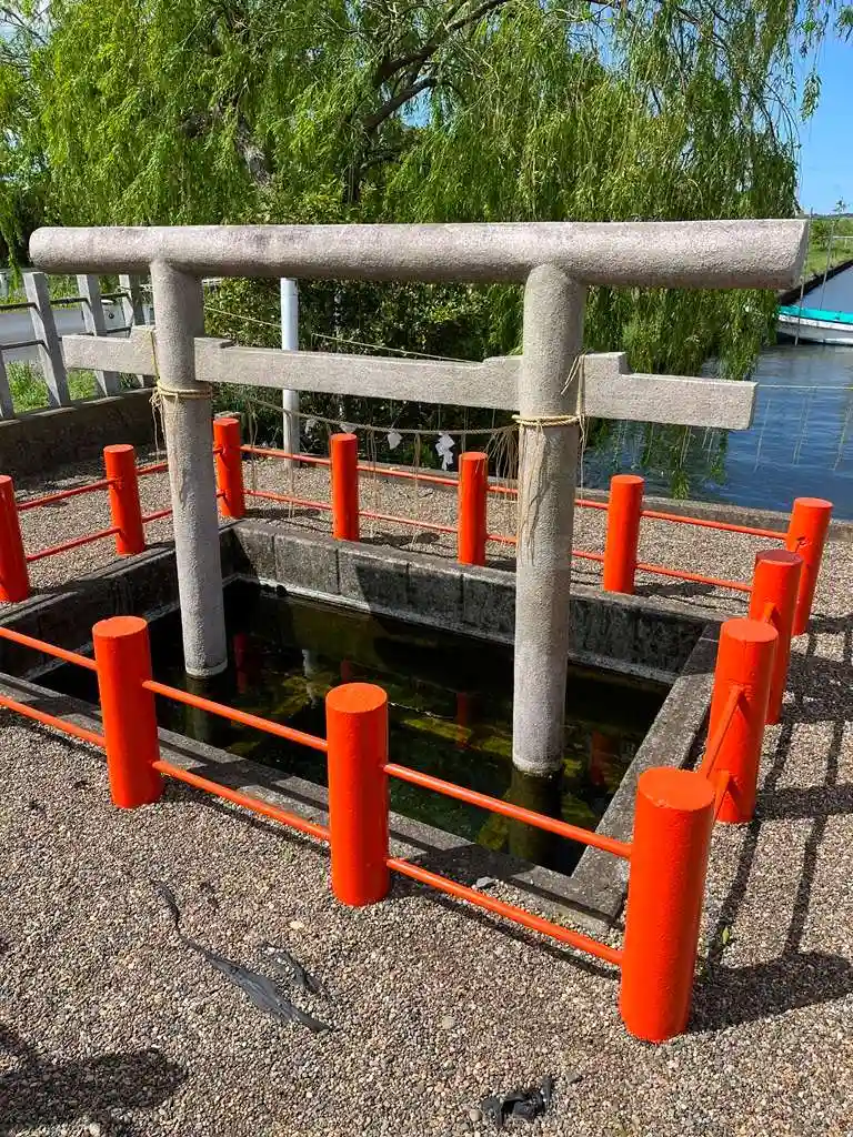 霞ヶ浦から海につながる川のほとりにあり、川と神社の境にある忍潮井(おしお…