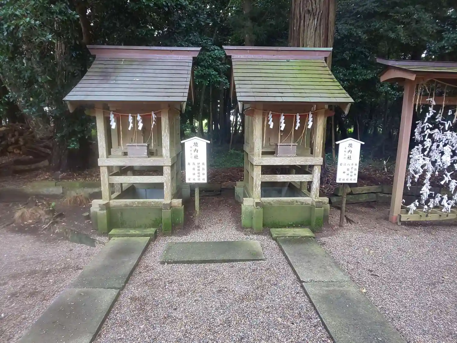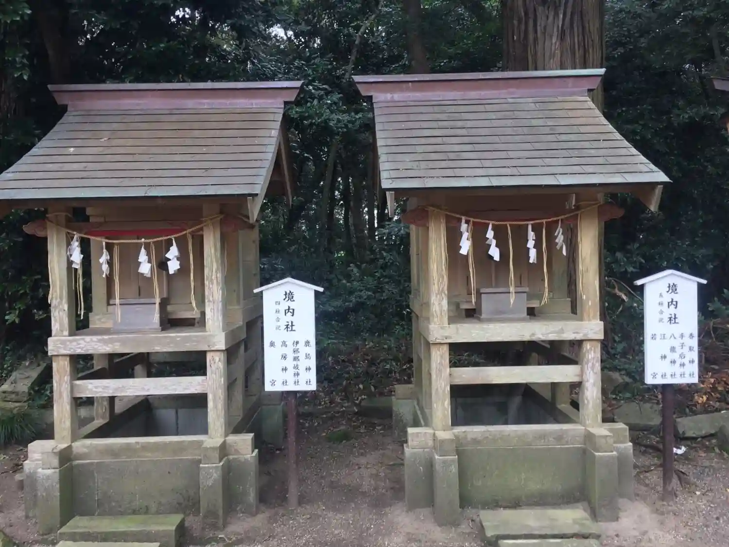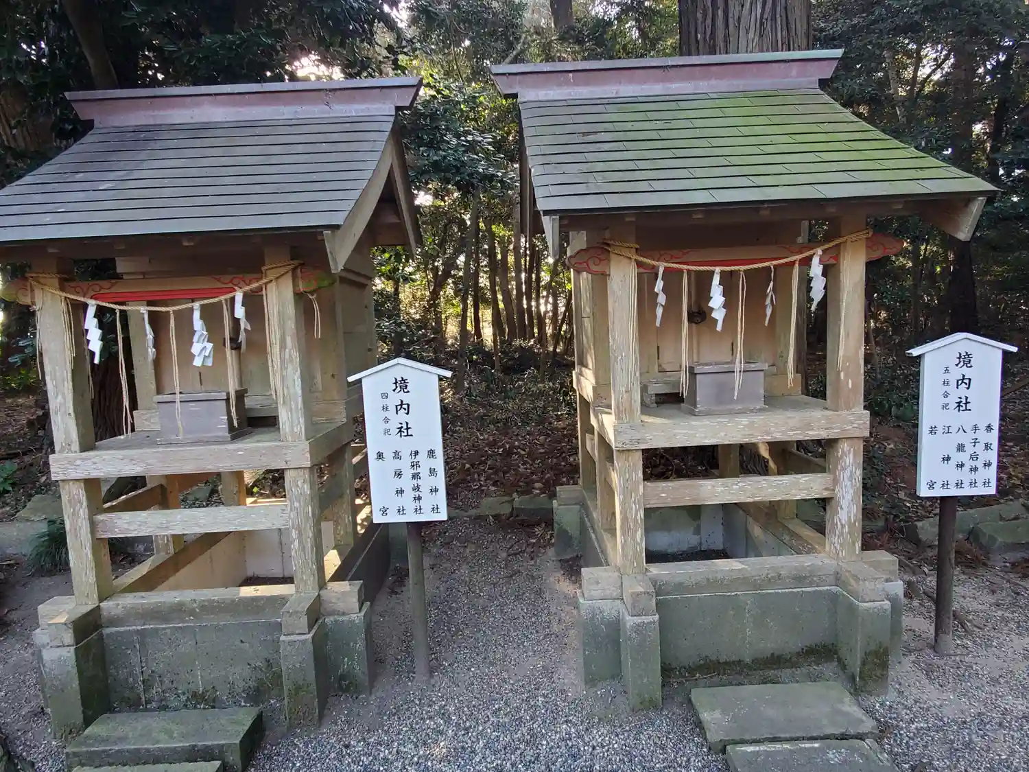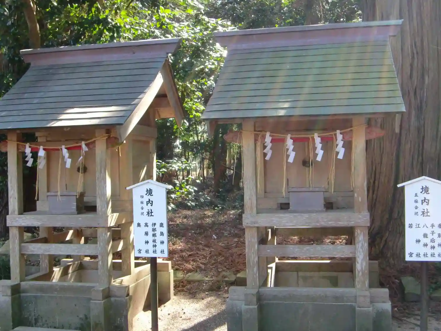 境内社 4柱合祀社(左)鹿島神社・伊邪那岐神社・高房神社・奥宮、5柱合祀社(右)香取神社・手子后神社・八龍神社・江神社・若宮