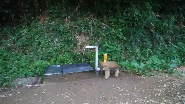 鳥居のある思井戸から北に一本隣の谷津にあります。看板など一切無く、地元でも場所はよくわからないという人が多いです。一度テレビ番組で紹介されたことがあるらしく、定期的に水汲みに来られる方もおられます。写真は、谷津への入口にある祠です。古墳のようにも見えますが詳細は分かりません。