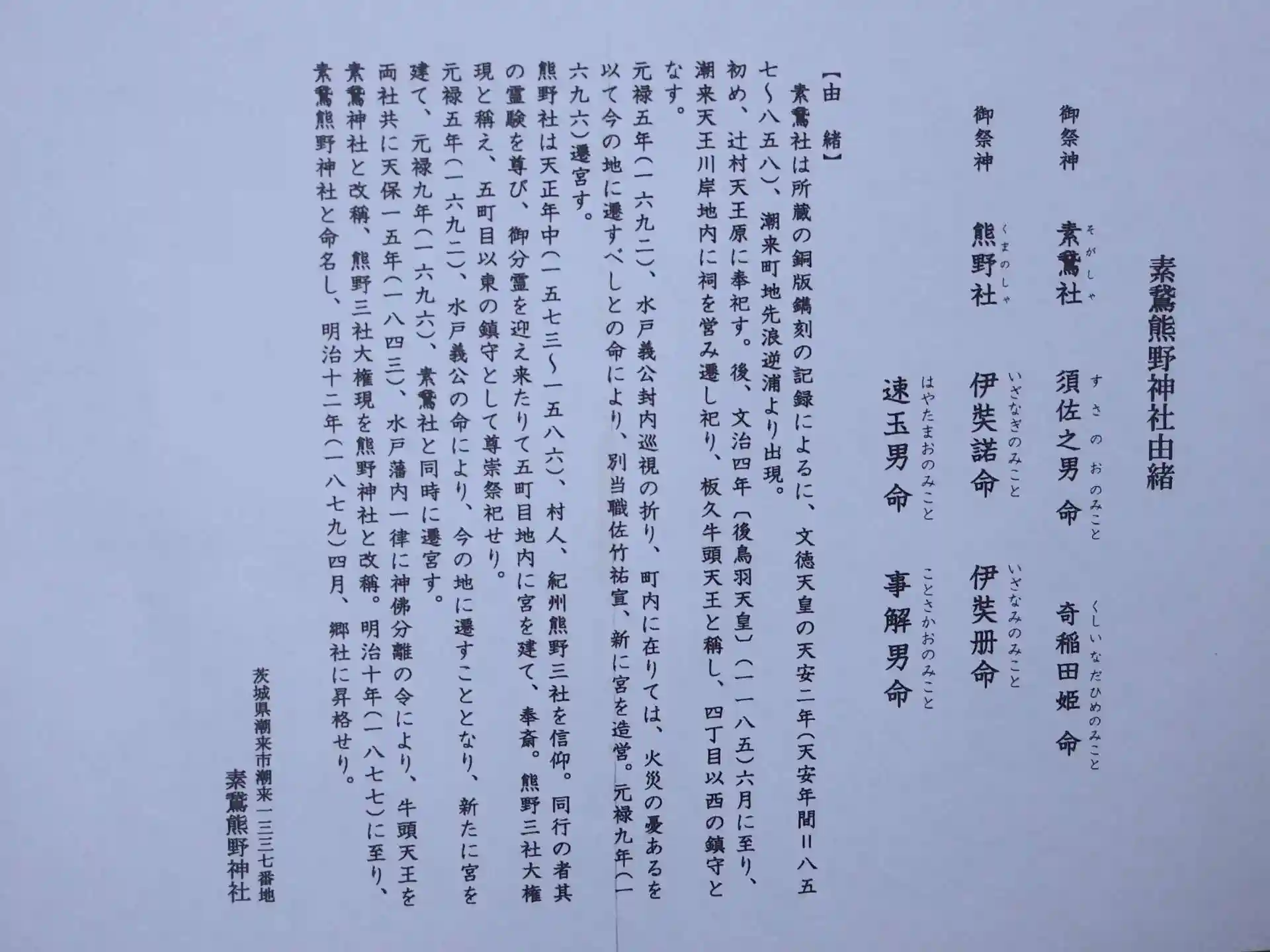 お賽銭箱の横に由緒書きの紙が置いてあります。