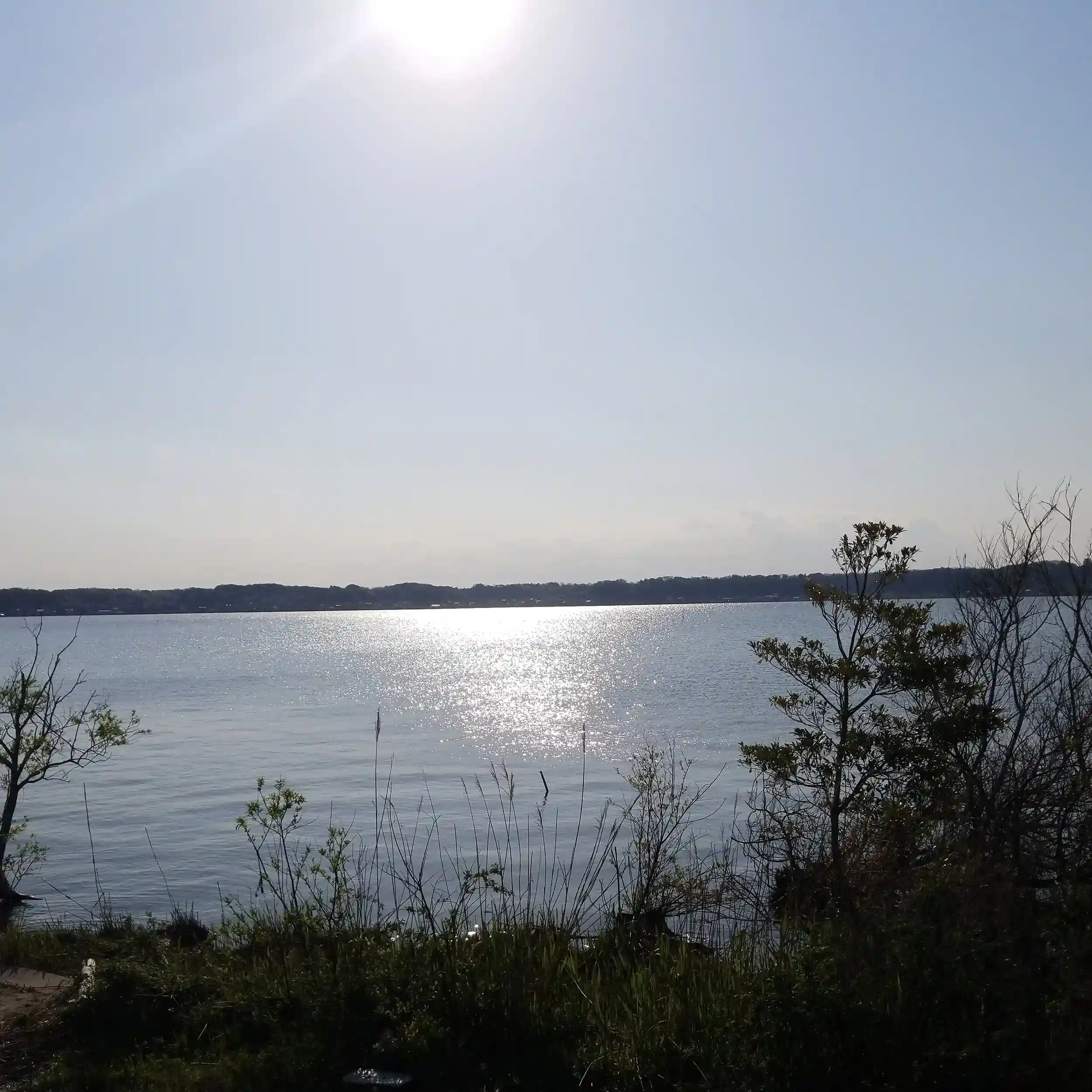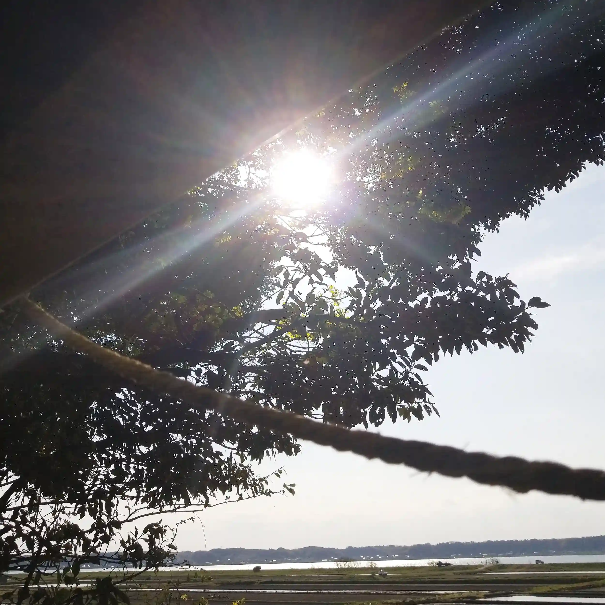 緑の中の鳥居から、太陽と水面の写真が