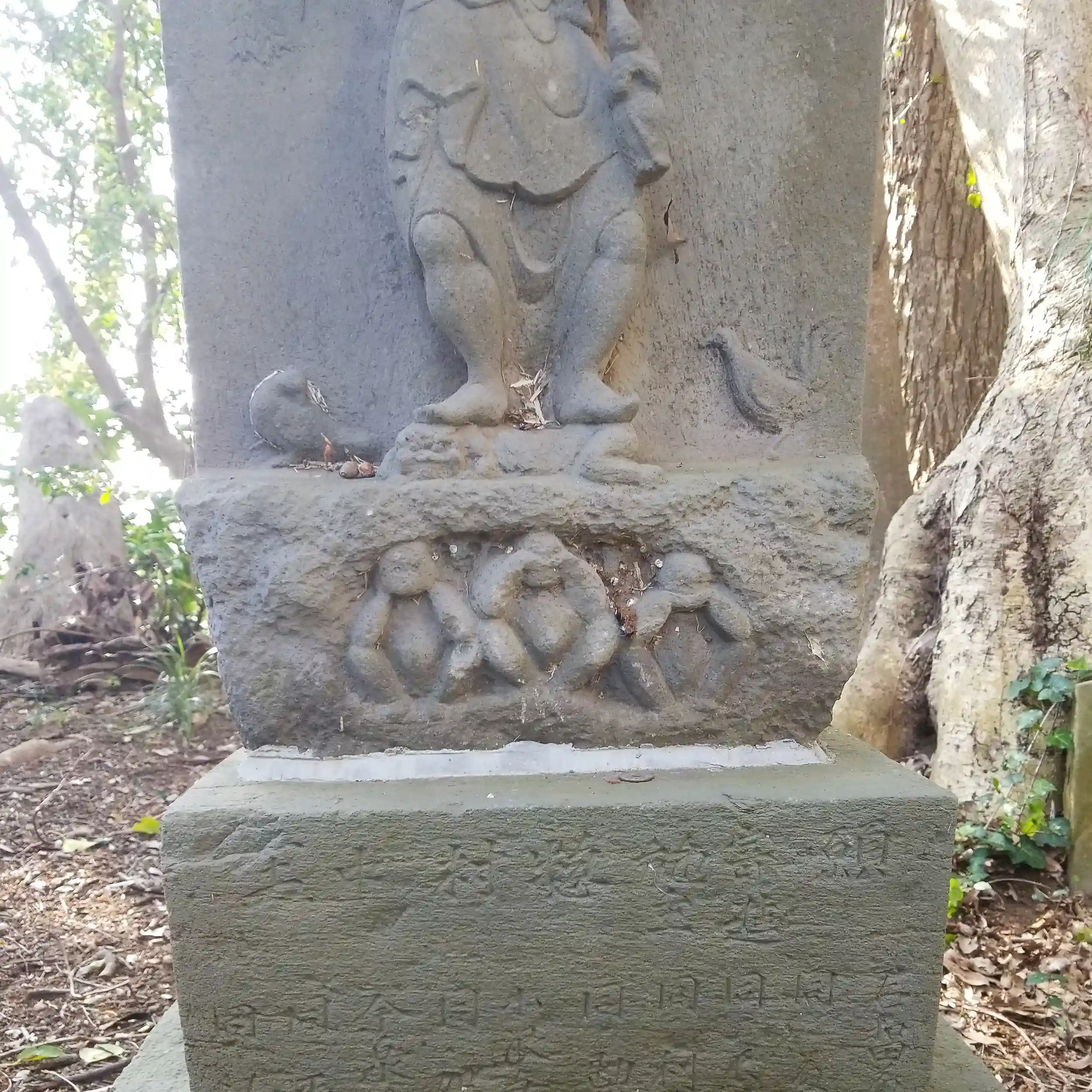 明王像の手に鬼、座に三猿、足元に鳩
