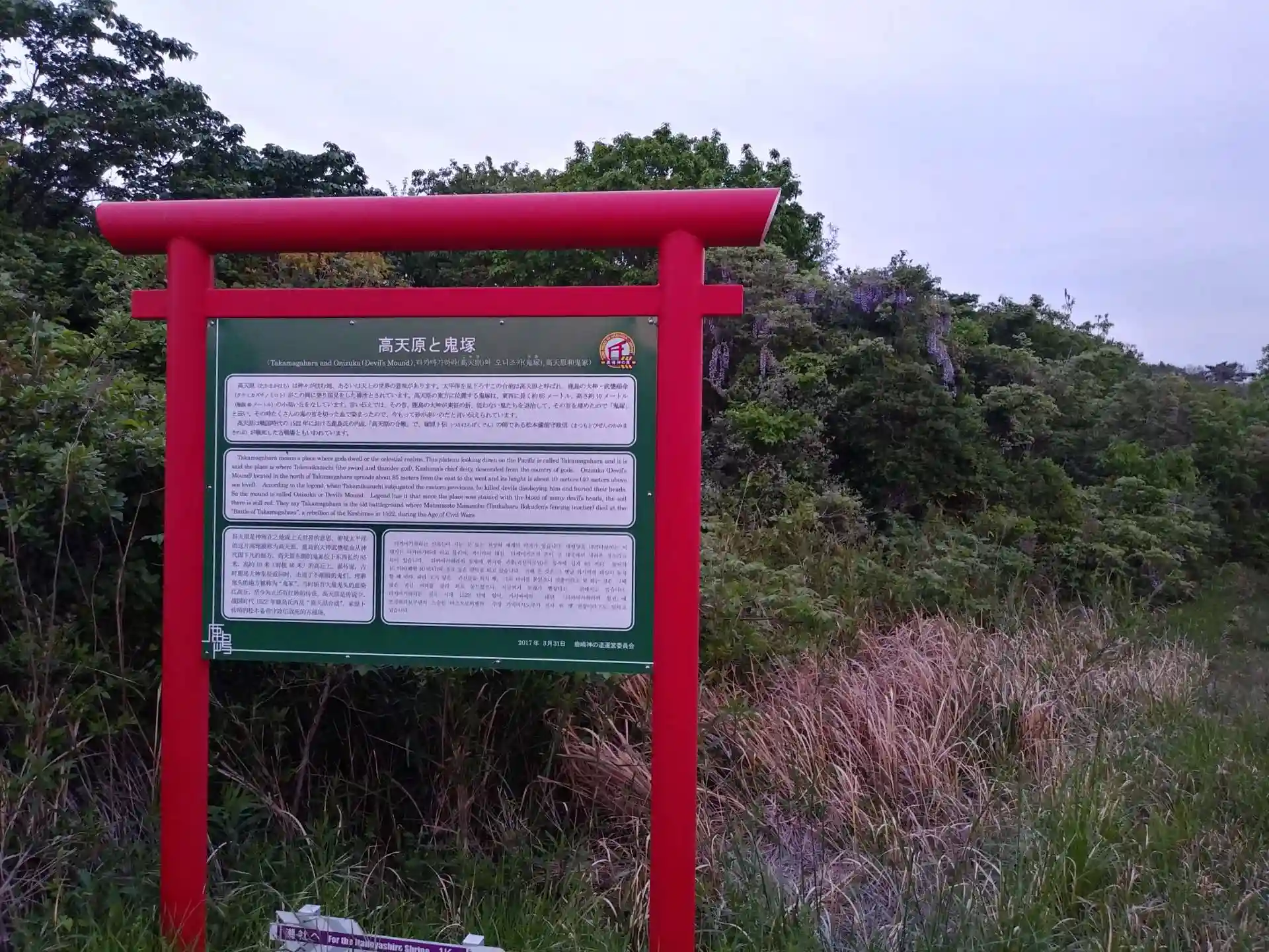 振り返ると、海岸からまっすぐ伸びる道路の先に高天原と鹿島神宮があります。神宮について調べ初めたころ、神宮の本殿がなぜ北向きなのか?という点にとても興味を持ちました。鹿島神宮宮司の東実さんの本によると、本殿は北向きですが、御神体は中で東を向いていて、これは出雲大社と共通する点だそうです。レイラインという補助線を引くことで、色々なことがスッキリ整理されたような気がします。
