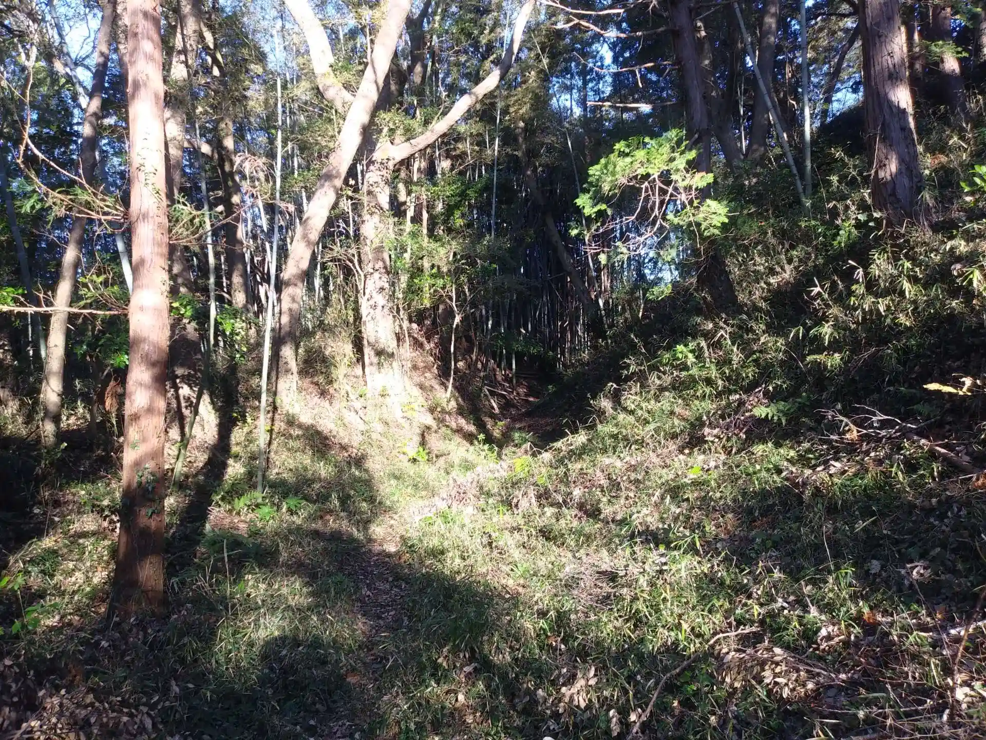 更に進むと空堀らしき谷間が現れます。この場所が神社でありお城であることがよくわかります。仮に籠城した際、飲み水を確保為には湧水までのラインを死守しないといけません。参道も真っ直ぐではなく山肌を斜めに登るこの地域のお城の特徴が現れてます。