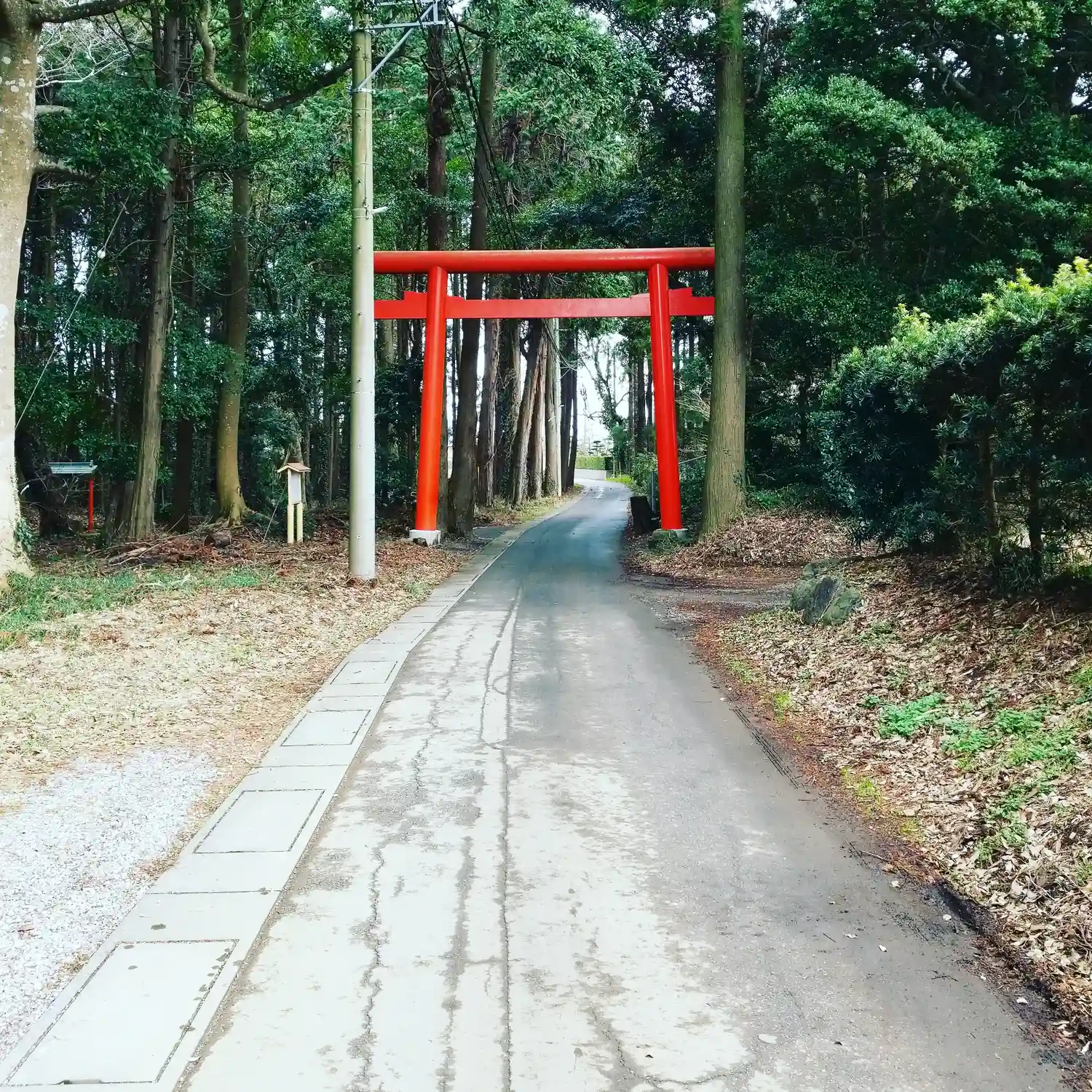 突如現れた鳥居。この先に神社がある訳でもなくひたすら道路があるのみ。およそ八キロ先に鹿島神宮があります。(どんだけ広いんじゃ!)鳥居のすぐ横には戸隠神社があります。