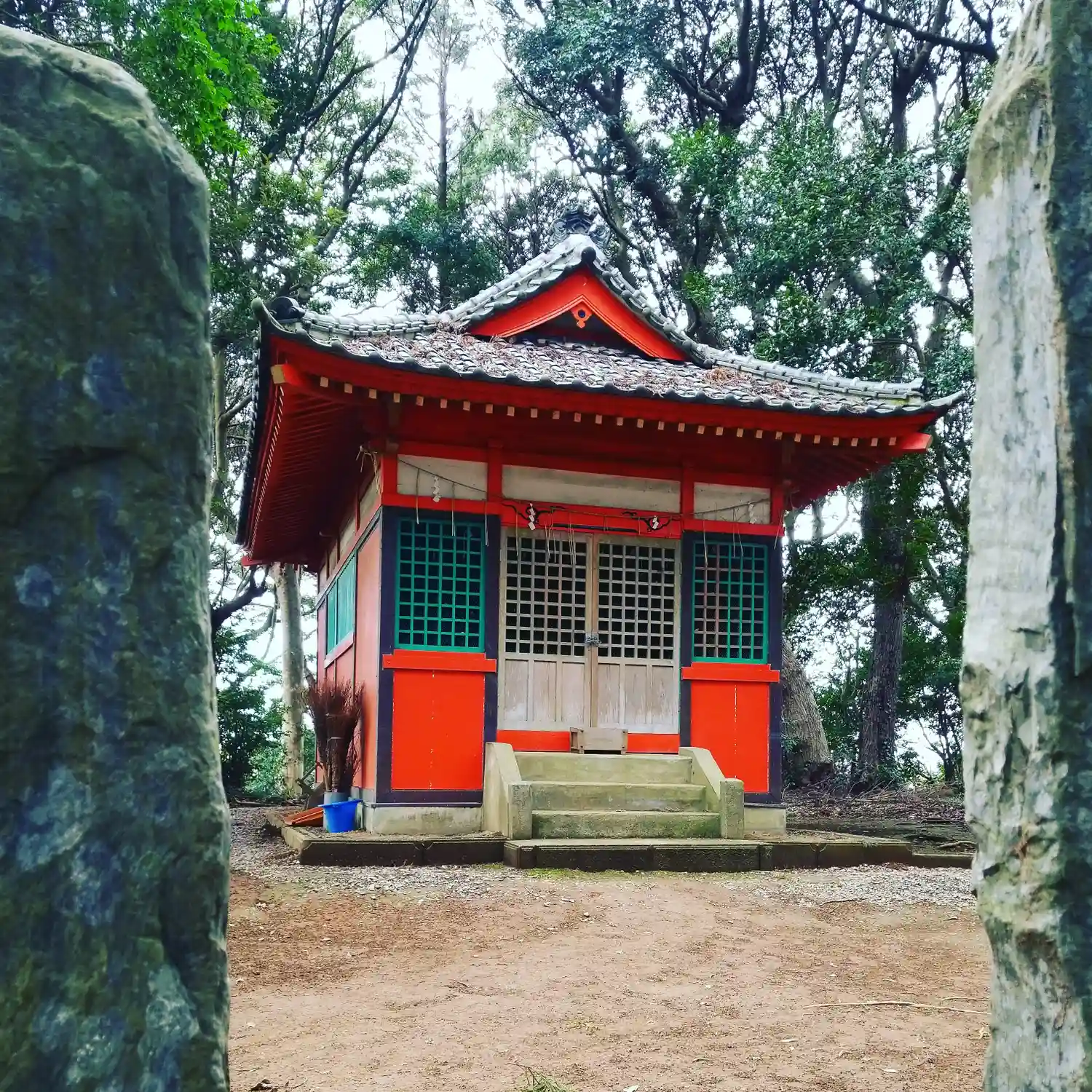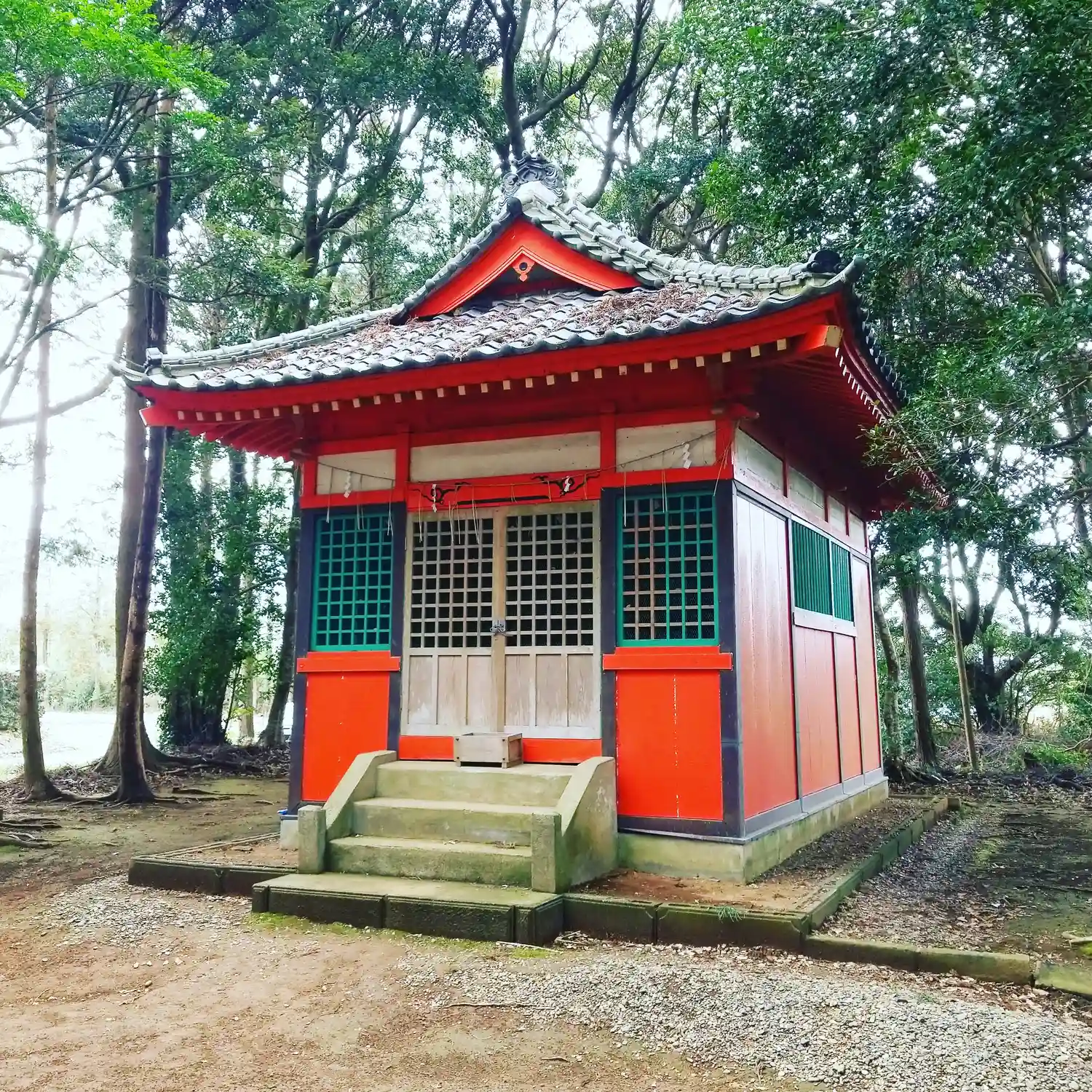 樹叢の中に社殿があります。キレイに掃き清められています。