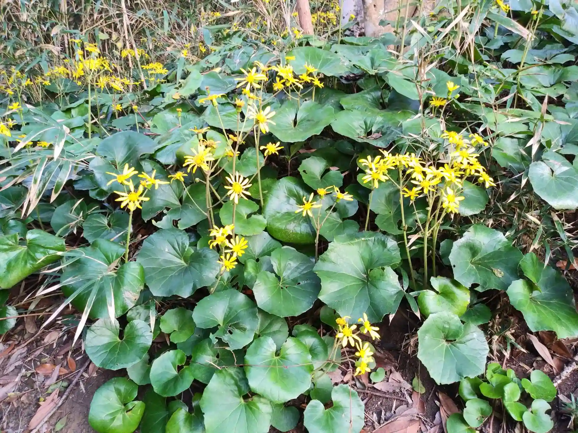 ふきの葉みたいなお皿のような葉の植物と黄色い花が、石段の脇にびっしり生えています。同じ植物なのかなぁ。